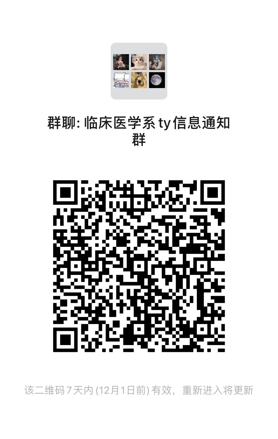 6、临床医学系ty信息通知群(二维码在12月1日前有效,逾期请至微信公众号“医路花开”后台留言或联系本班辅导员老师)