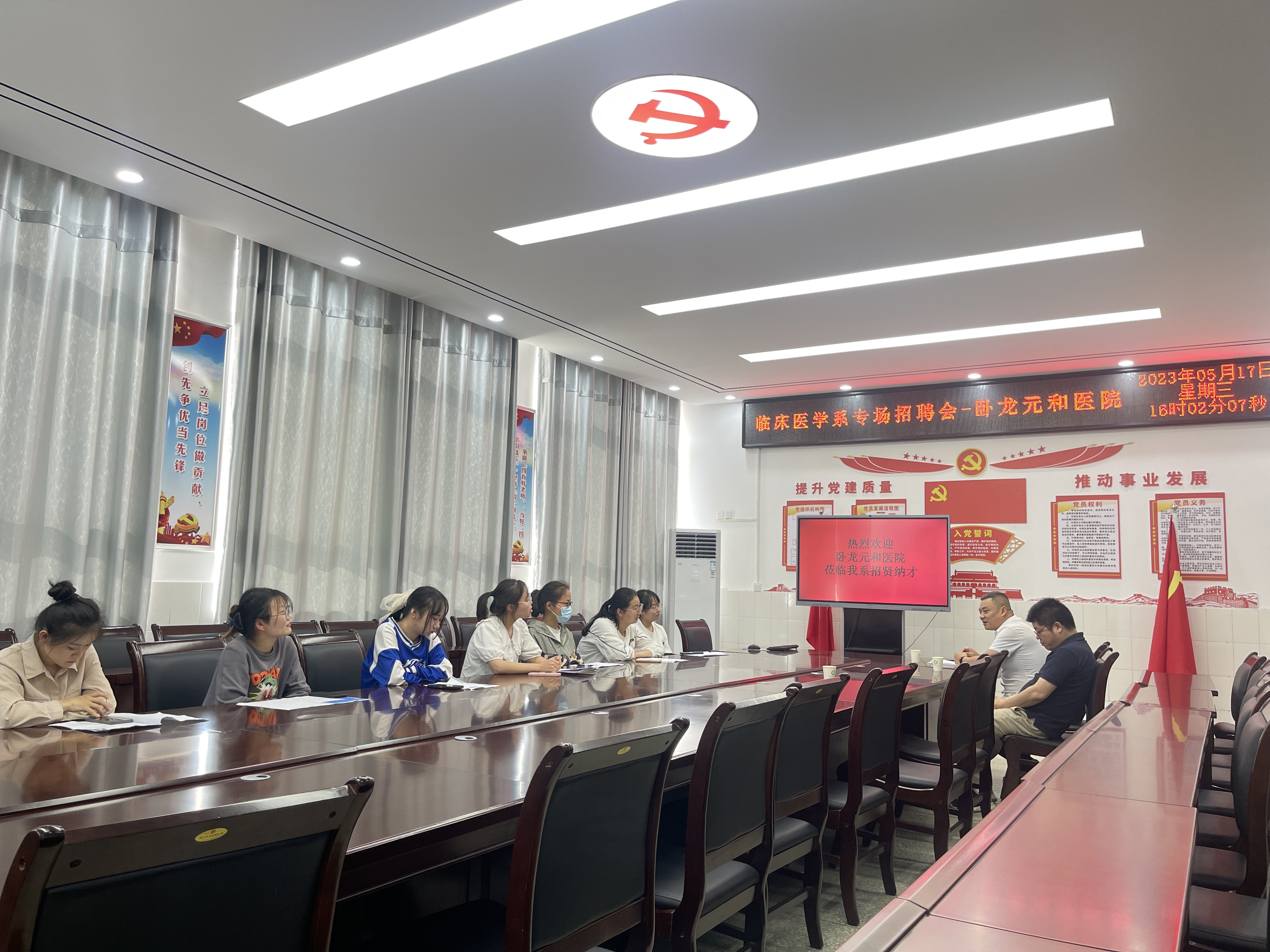2023年5月17日下午三点,临床医学系分别在四号教学楼408会议室、301教室举行专场招聘会。参加本次招聘会的用人单位主要有卧龙元和医院、卧龙民投康宁中医院。