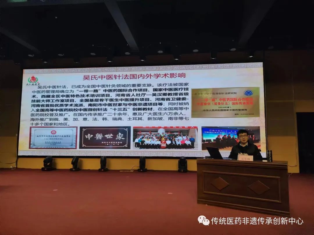 吴军瑞以《传统医药非遗项目吴氏中医针法的传承与创新实践》为题,系统介绍了吴氏针灸的太极龙关针法、六经脉证针法经方精要、中医筋骨针法与水针刀疗法,以及以十四筋脉三观定位法为基础,伤寒六经辩证为诊断依据的吴氏中医针法学术思想。他结合南阳医专创立的传统医药非遗传承创新中心,阐释中医院校应打破传统教学模式,将非遗传承纳入学校的选修课,促进非遗特色项目进校园,将非遗传承理论教学与临床实践紧密结合,培养实战型中医传承人,实现传统教育与非遗创新教育优势互补。