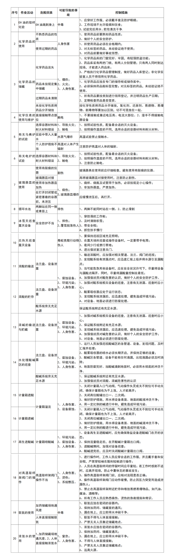 四、如何有效进行危险源的控制针对不同的危险源及可能引发的安全事故采取相应的对策措施?实验室有毒有害药品的使用首先为防止试验室内危险化学品中毒、污染最理想的方法是不使用有毒有害和易燃、易爆的化学品,但是这很难做到,因而可选用无毒或低毒的化学品替代有毒有害的化学品或改进工艺。例如在用重铬酸盐法检测化学需氧量(COD)时,为消除或减少氯化物的干扰需加硫酸汞进行去除,而硫酸汞是极毒物质。我们经过多次实验,针对水质的具体情况,对氯离子含量不高的水质尽可能地不使用硫酸汞。其次是试验室最为常见的是火灾、爆炸事故,做好这类事故的预防工作,要消除可能引起燃烧爆炸的危险因素,就要使可燃物质不处于危险状态。在实验过程中应谨慎使用、规范操作易燃易爆物质,要防止可燃物与空气或其它氧化剂作用形成危险状态。健全实验室的各种细分管理制度要加强试验室岗位责任制,使各项安全生产责任落实到人,明确各自的分工与责任。建立各种安全规章制度,如《药品管理制度》安排专人进行采购、登记、领用、发放。试验室负责人应对贵重及危险化学品进行妥善管理和安排使用;《仪器设备管理制度》试验室各种仪器设备由专人负责。负责人应熟悉仪器设备的使用方法及特性,做好维护保养工作,使仪器设备处于正常完好状态;《安全用电制度》试验室所有人员必须明确试验室总电源开关及各电器电源的位置,实验操作结束后及时关掉电源。电路或用电设备出现故障时,必须先切断电源后,方可进行检查;《安全防火制度》试验室里有较多的易燃易挥发化学品,还有电炉、烘箱等,使用或操作不当极易引起火灾,应在试验室里配备消防设施等等。