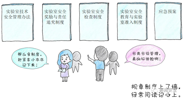 如各类仪器设备的操作规程,各种检测的操作规程。如易燃、易爆物品必须存放在安全处;进入试验室必须穿着实验服;进行有毒、有害、有刺激性物质或有腐蚀性物质操作时,必须穿戴防护服和防护手套;在实验中应遵守操作规程严格按规定的程序和步骤进行(如稀释浓硫酸时必须缓慢地将浓硫酸加入到水中,而不是将水加到浓硫酸中);挥发性物质须在通风橱中进行操作。试验室产生的工作废液,应在安全负责人的指导下妥善处理,(尤其是剧毒或强致癌物质)不得随意处理废旧药品,而由专人回收,统一进行处理。