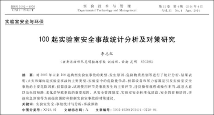 基于2001 至 2013 年 100 起实验室事故的一项研究发现,造成事故的人为原因包括违反操作规程(占 27%)、操作不当(占 12%)、操作不慎或使用不当(占 11%),合计达到事故总数的一半。