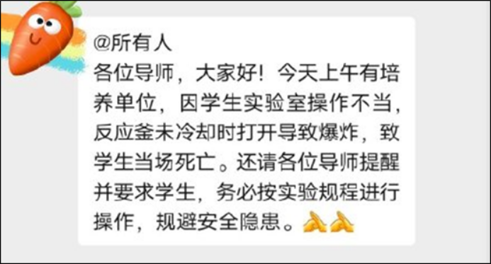 中科院化学所在3 月 31 日发生了一起事故,反应釜爆炸致一人当场死亡。根据网传消息,事故发生的原因似乎是该同学没有经过冷却就打开反应釜,最终导致了反应釜爆炸。