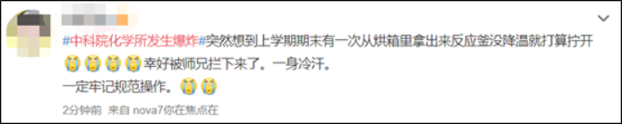 事件发生过后,不少网友都回应了当年自己和反应釜打交道的日子,可以说是实验不规范,惊出一身冷汗。比如这位,也是没降温就想开反应釜,幸好被师兄拦下;