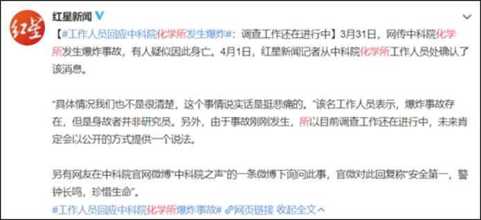 4 月 1 日,红星新闻就此事对中科院化学所工作人员进行了采访,确认了消息的真实性,据红星新闻报道,该工作人员在回应中表示,爆炸事故存在,但是身故者并非研究员,具体情况仍在调查,未来会以公开方式提供相关的说法。