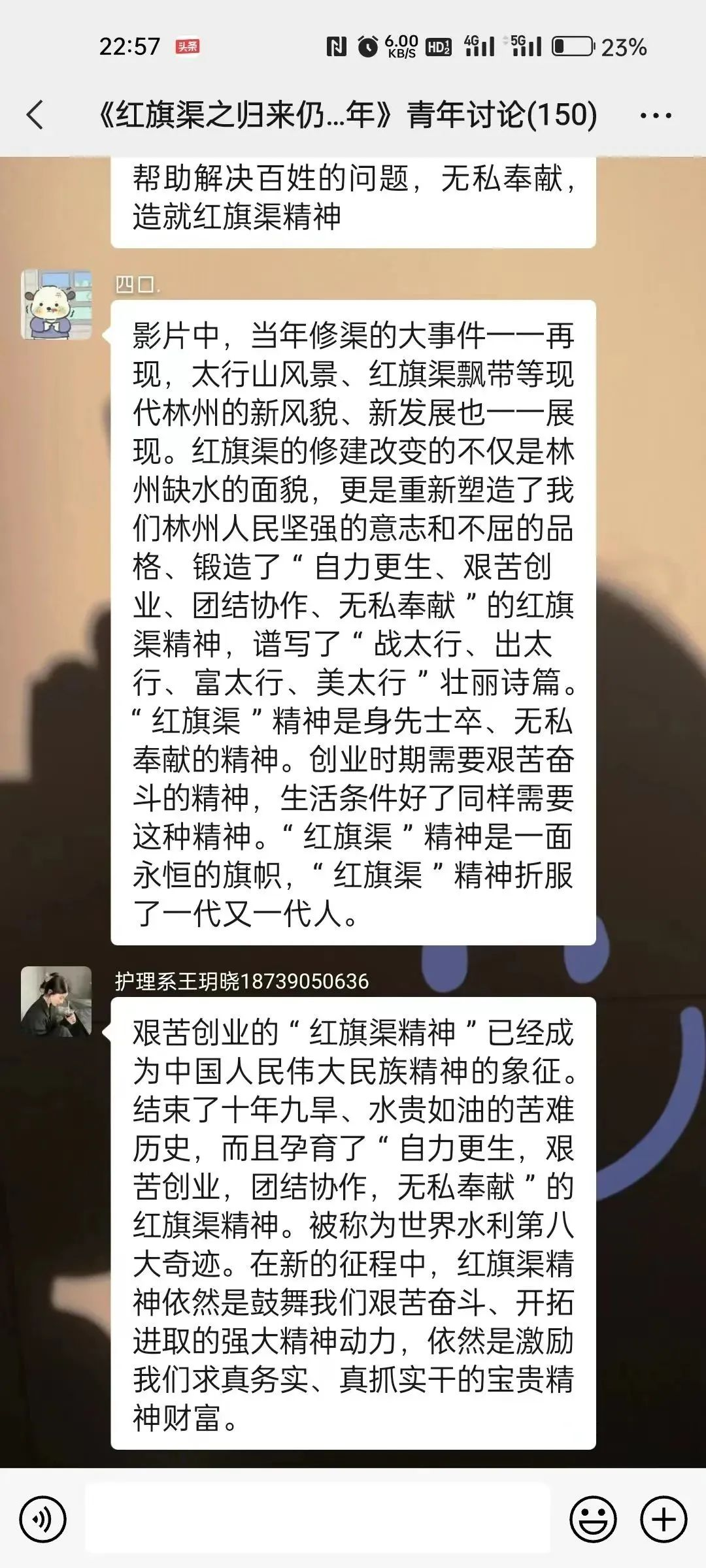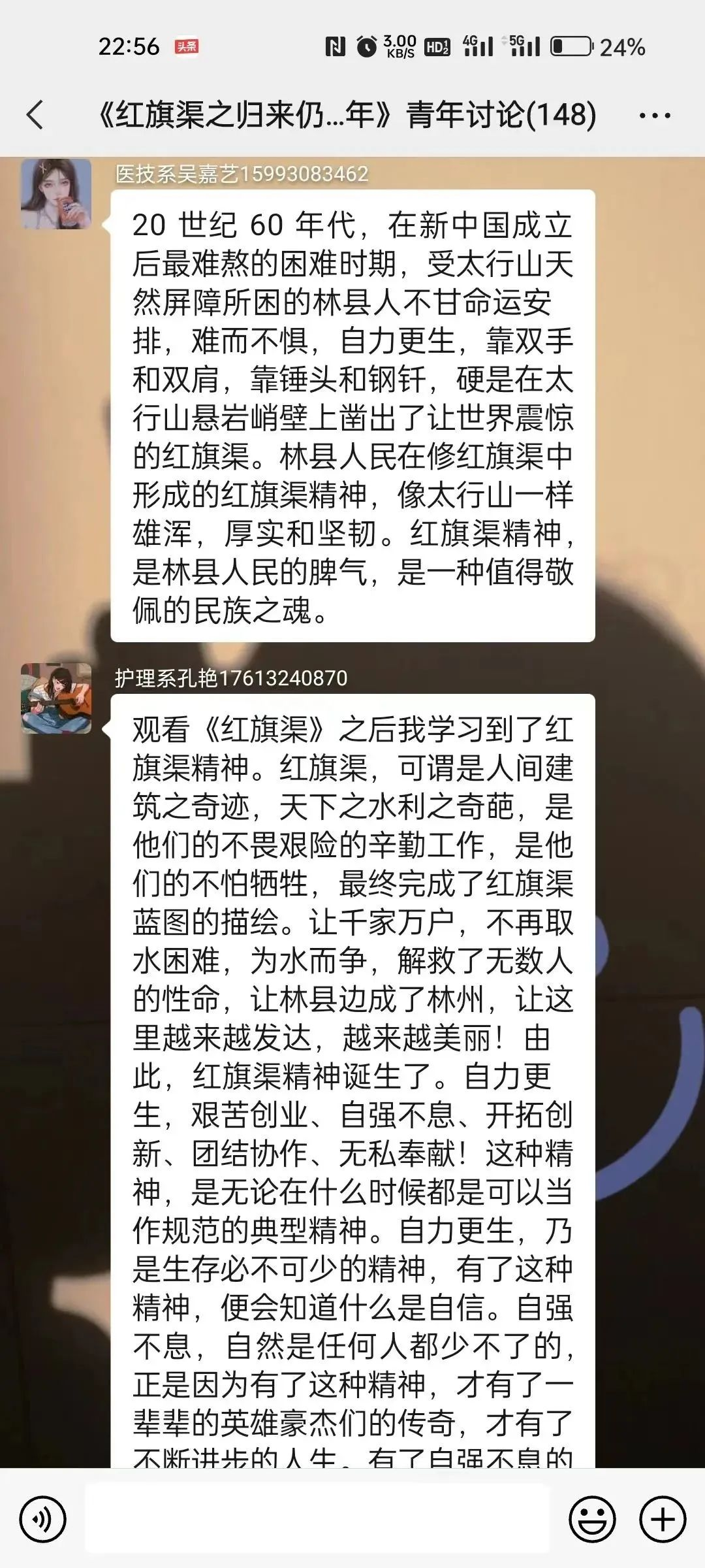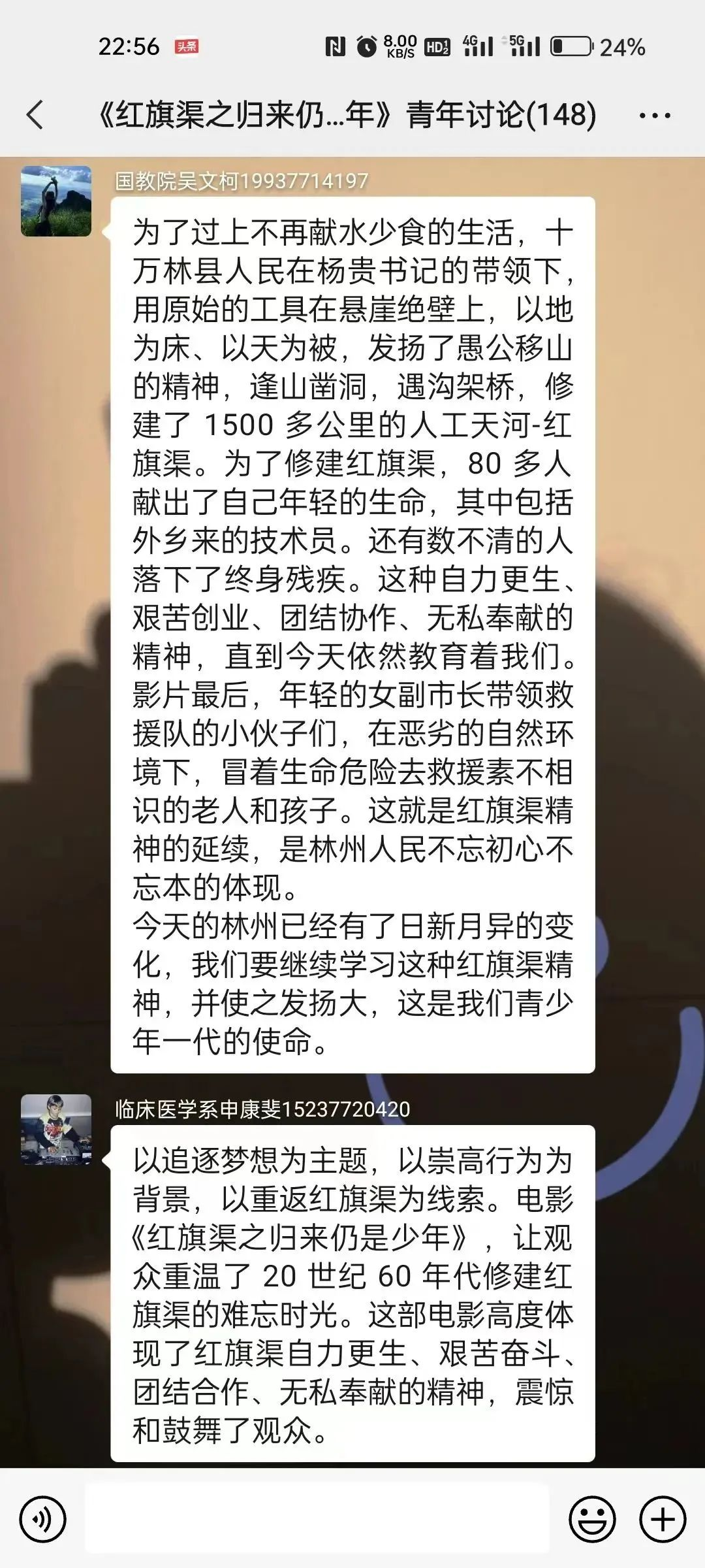 “红旗渠就是纪念碑,记载了林县人不认命、不服输、敢于战天斗地的英雄气概。”学生代表申浩展观影后发表个人感言,他讲述了自己在观影中的所思所想,激励同学们把红旗渠精神融入日常,化作经常,努力成长为可堪重任的新时代国家栋梁。此次活动反响强烈,同学们通过线上微信群讨论和线下座谈会的形式,纷纷表示收获颇多,作为新时代青年,要将红旗渠精神转化成学习和工作的实际行动,转化成战胜一切困难的坚强意志,转化成更大的责任担当和更高的目标要求,鼓起迈进新征程、奋进新时代的精气神,为全面建设社会主义现代化国家贡献力量。