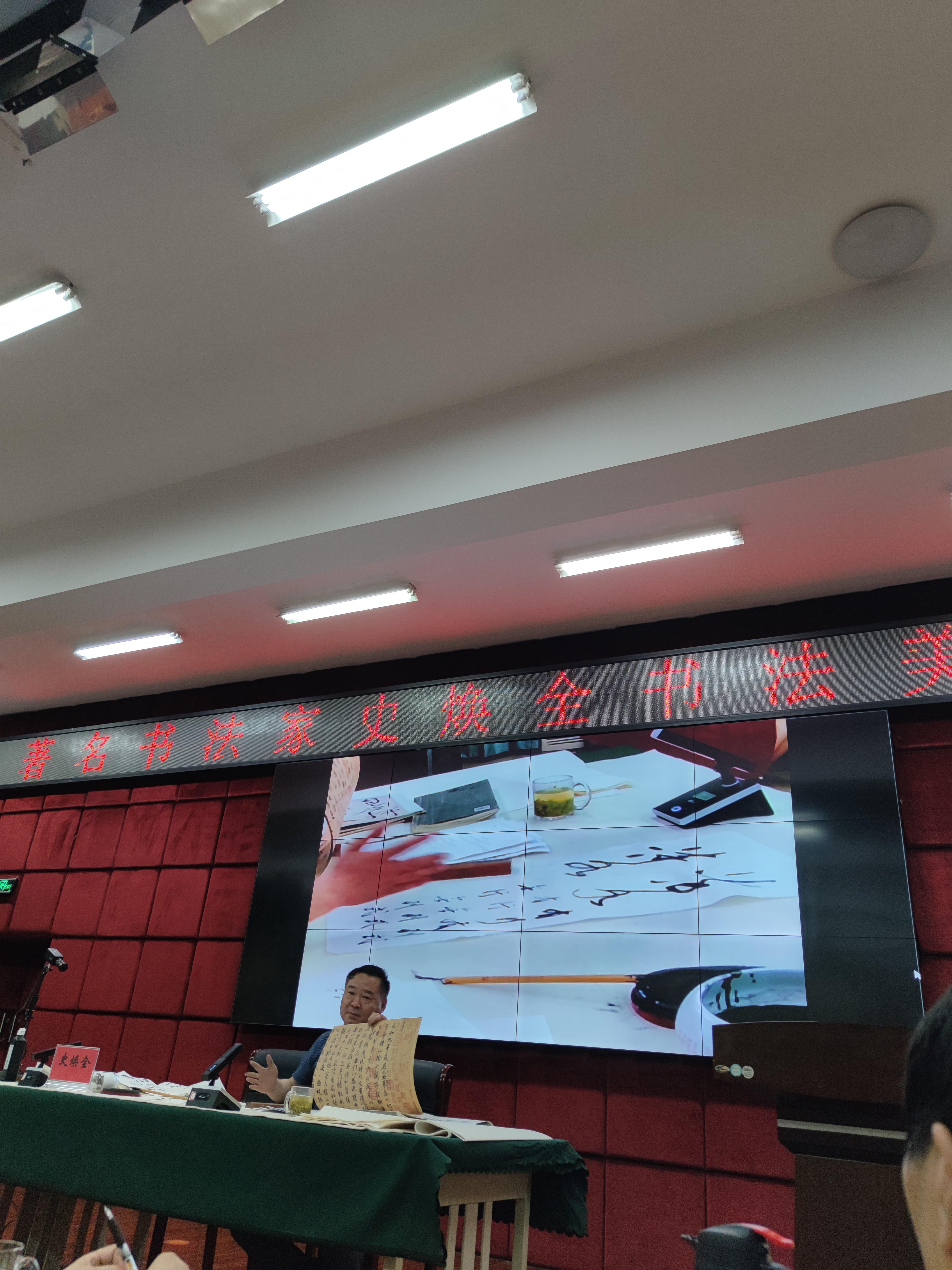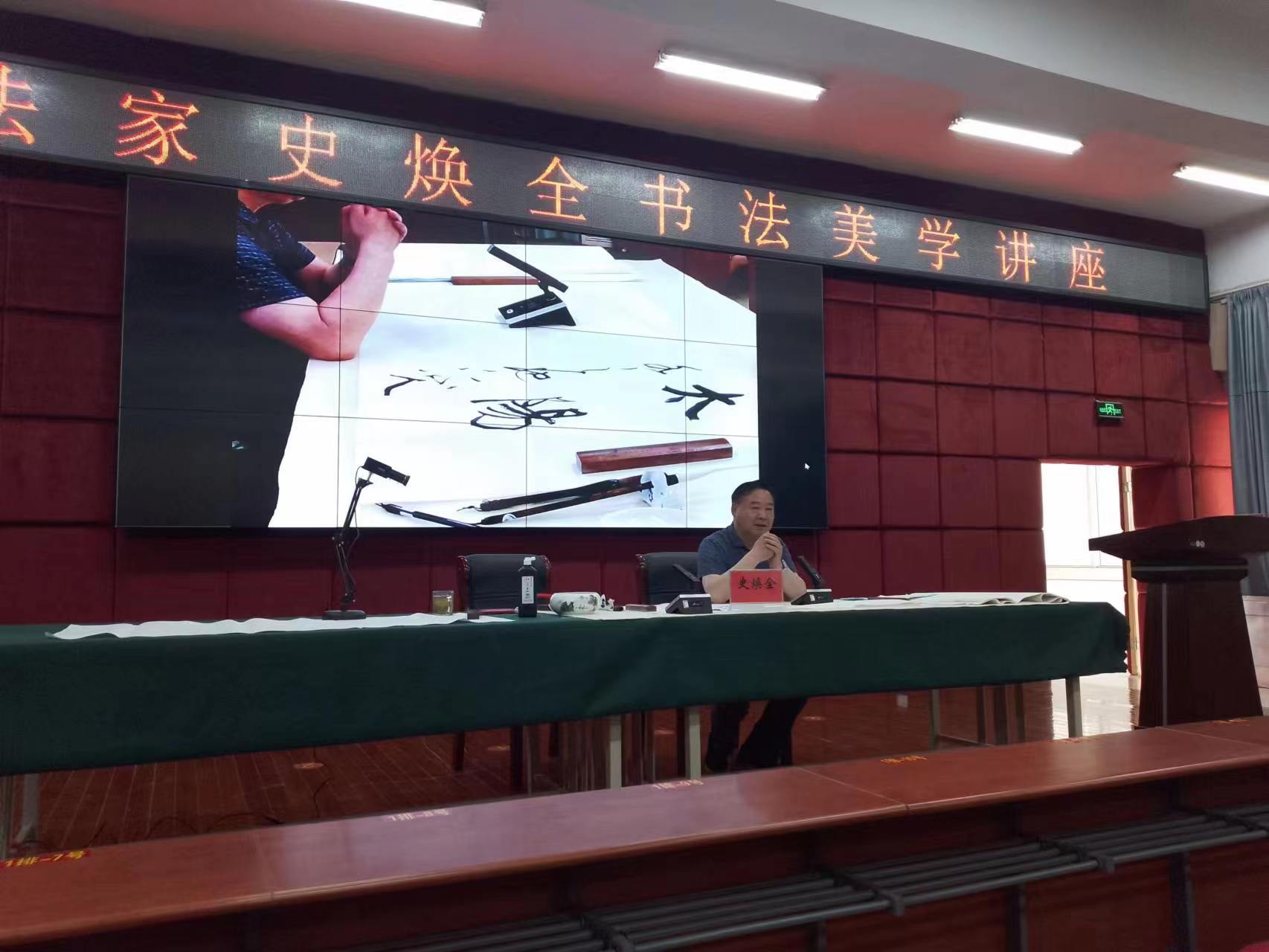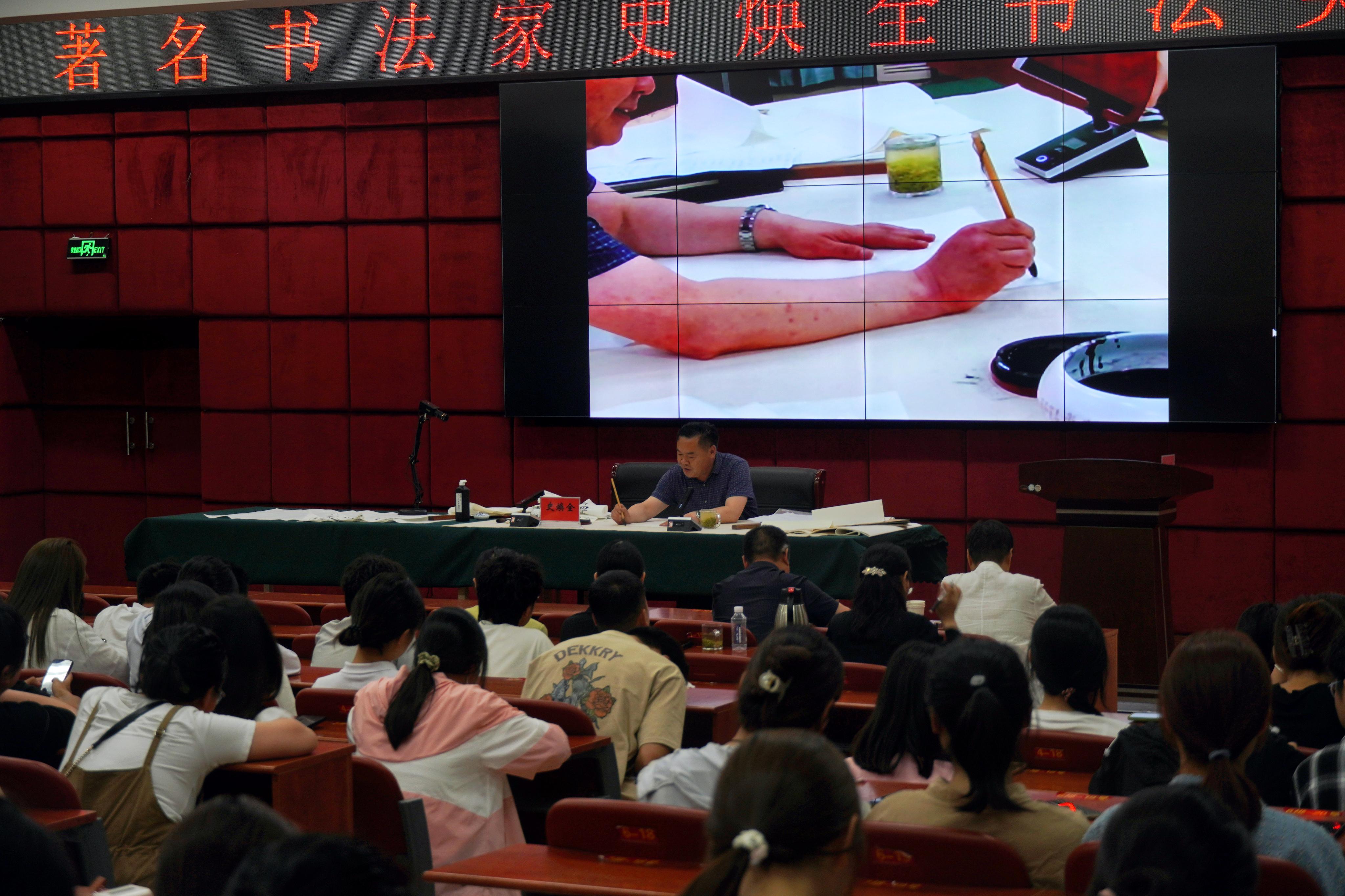 为提高师生艺术修养,助力学生成长成才,5月18日下午,我校邀请著名书法家史焕全教授在图书馆五楼学术报告厅作书法美学学术讲座。学生书法社团、广大师生书法热爱者约三百人聆听受益。