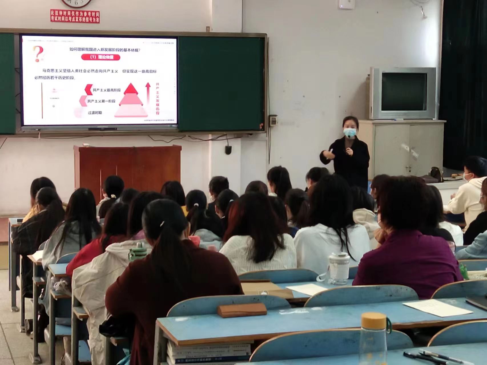 课堂上,马克思主义学院庞丽老师主讲“以新发展理念引领高质量发展”专题,以“中国制造”与“中国质量”切入课程主题,聚焦我国的新发展阶段、新发展理念和新发展格局三个方面,进行了深入浅出的讲解。