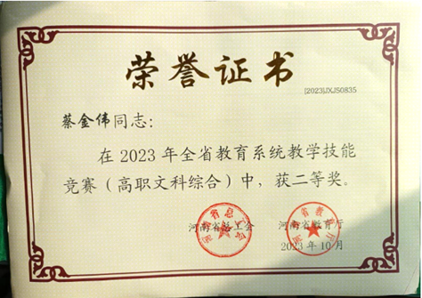 近日,河南省总工会、河南省教育厅联合下发《关于2023年河南省教学技能竞赛获奖情况的通报》(豫工文〔2023〕107号),对获奖的集体和个人进行表彰,我系蔡金伟老师获得高职文科组综合类二等奖。