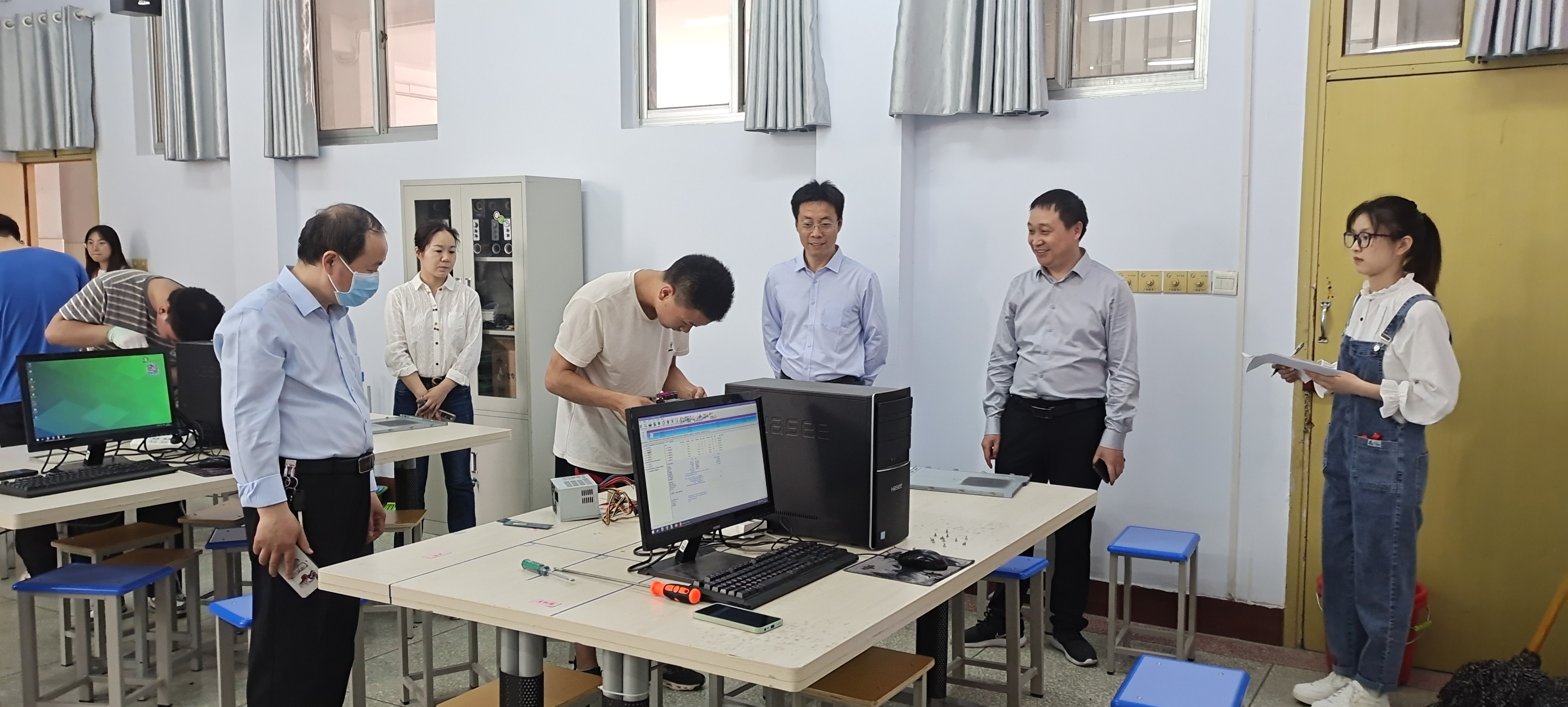 系领导严密组织此活动,全过程参与,评委老师细心记录与打分。参与此赛项的同学独自完成拔掉计算机内的各类线缆,并将计算机中的主要部件拆下后按指定位置摆放整齐,将所有零散计算机配件正确组成一台电脑,用工具软件对硬盘进行分区并格式化,安装Windows 7操作系统到C盘并使所有的设备能正常工作(完成驱动程序安装)。同学们比赛过程表现出色,每个人都顺利完成了任务。