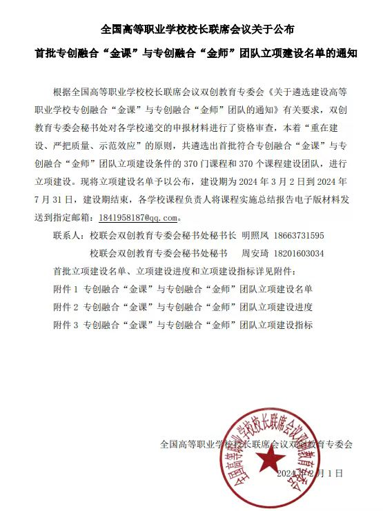 据悉,此次遴选是由全国高等职业学校校长联席会议双创教育专委会主办,旨在贯彻落实《国务院办公厅关于深化高等学校创新创业教育改革的实施意见》和《国务院办公厅关于进一步支持大学生创新创业的指导意见》文件精神,推进“金专业、金课程、金师资、金基地、金教材”的“五金”建设,做实双创教育,聚焦专业群课程内涵升级、教学资源建设、双创项目产出、科研成果转化、教师能力提升和教学模式创新,将双创教育与专业教育有机融合并贯穿人才培养全过程,提高学生就业创业的适应力、胜任力,提升师生的家国情怀、责任担当和国际视野。