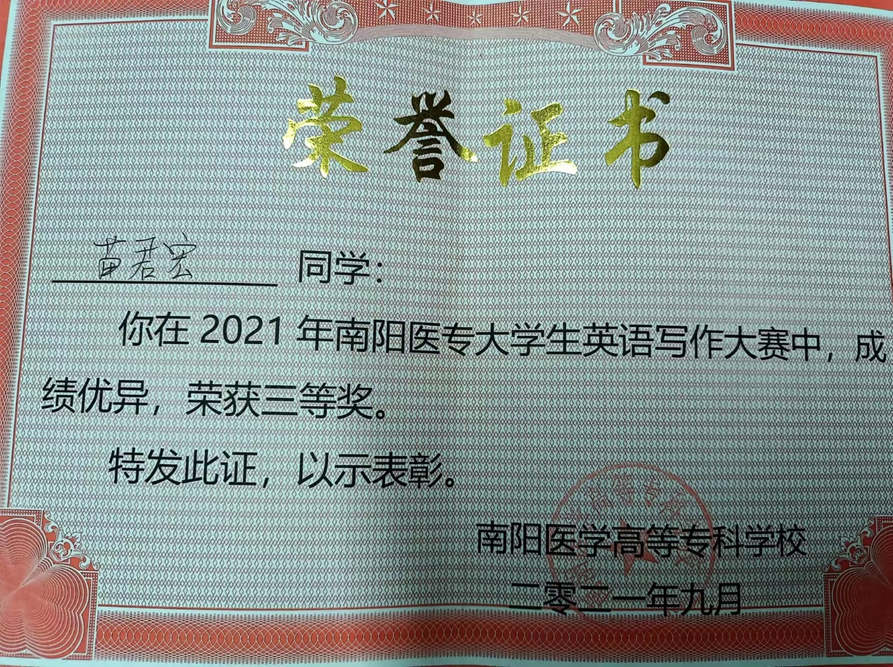 在校期间充分发挥自己的力量进行学习和工作,不断的提高自己的工作能力和思想觉悟,并且积极运用有效的方法,合理安排各种时间。参加我校“英语写作大赛”并荣获三等奖,获得卫生管理系“创新创业比赛”二等奖。在学校开学迎新中,多次主动报名参加志愿者为学生提供志愿服务,充分展现南医体贴学生,时时刻刻为学生着想,并做好进校疫情防控,为南医开学季、疫情防控要求做出杰出贡献,获得了“优秀青年志愿者”称号。长期以来的学习锻炼、工作付出,明白了如何面对工作中的困难,如何正确对待、正确处理各项问题,并勇于、敢于面对可能发生的任何问题,做到将问题“从大到小,从有到无”。在这些过程中她明白了当下的成绩只能代表过去,不能留恋,并且永不满足于现状,吸取过去活动中得到的经验教训,在今后的日子里以更严格的标准来激励、鞭策自己,以求有更优异的表现。