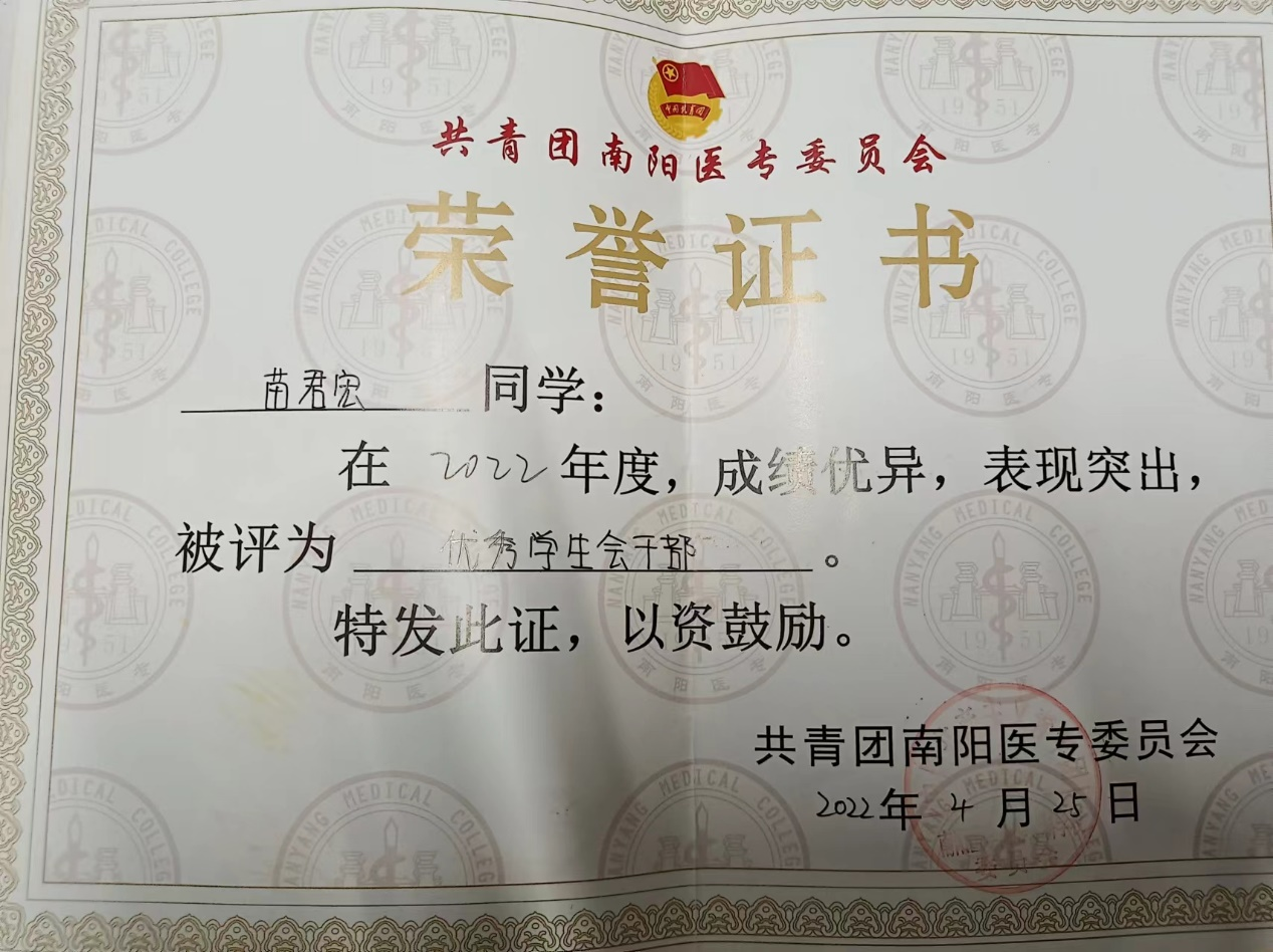 苗君宏同学自入校以来,努力学习,目标明确,树立正确的价值观。学习中做到了理论联系实际,还注重各方面知识的扩展,有良好的生活态度和生活作风,为人诚实守信、乐于助人,不仅在班里担任班委,协助班长完成工作,帮助同学解疑答惑,与同学和睦相处,被评为“优秀学生干部”,同时加入系部学生会参与组织各项活动,并且在大二担任部长,被评为“优秀学生会干部”,成为老师的得力助手,从而不断丰富自己的阅历。