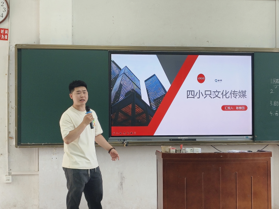 南阳四小只文化传媒有限公司人事运维部负责人陈修国向参会同学介绍了公司的基本情况,展示了公司员工的工作环境、薪资待遇、休息休假等情况,对本次招聘岗位、用人需求和招聘人数做了详细介绍。