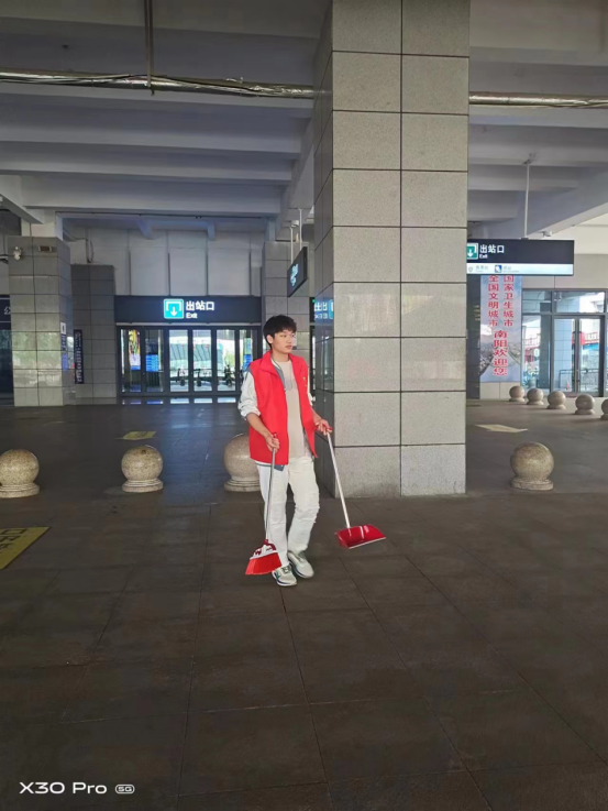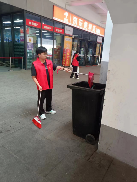 活动中,带队老师带领志愿者们搭建志愿服务点,为游客提供安全饮用水、问询、安全乘车、宣传南阳文化等志愿服务,积极营造环境干净整洁、交通秩序良好、服务规范有序、崇德向善的良好社会风尚。为了让游客保持好心情,对南阳有一个好的印象,志愿者们拿着扫帚清扫地面垃圾。面对游客,为其服务时,志愿者们面带微笑,语气温柔,态度端正,用语文明,尽自己最大的努力,为其提供帮助。