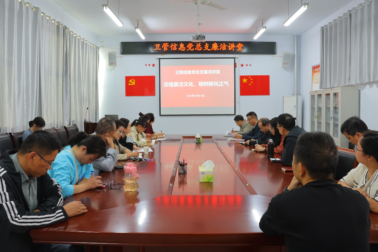 卫管信息党总副书记钮靖以《厚植廉洁文化,培树新风正气》为主题做了专题廉洁讲座,围绕习近平总书记在十九届中央纪委六次全会发表的重要讲话展开,结合我国优秀传统文化和全面从严治党一直在路上的决心,列举了包拯、海瑞、焦裕禄、牛玉儒、任长霞等一个个廉洁典范,为全体党员干部上了一堂生动的廉洁文化教育。