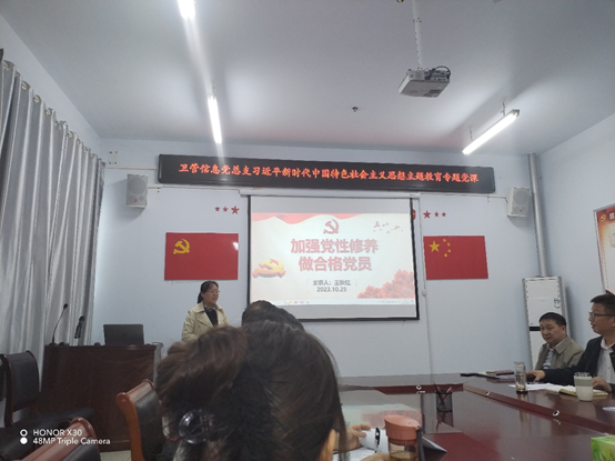 20231023日下午,卫管信息党总支教工支部书记王秋红以《加强党性修养,做合格党员》为题,在仲景西区厚德楼三楼党员活动中心为支部党员讲授党课,卫管信息党总支教工支部参加。王秋红从“践行群众路线——乐于奉献”、“立足本职工作,全心全意为人民服务”、“始终保持共产党人的本色”、“新时期不忘初心”四个方面进行了专题讲授并与大家交流学习体会。