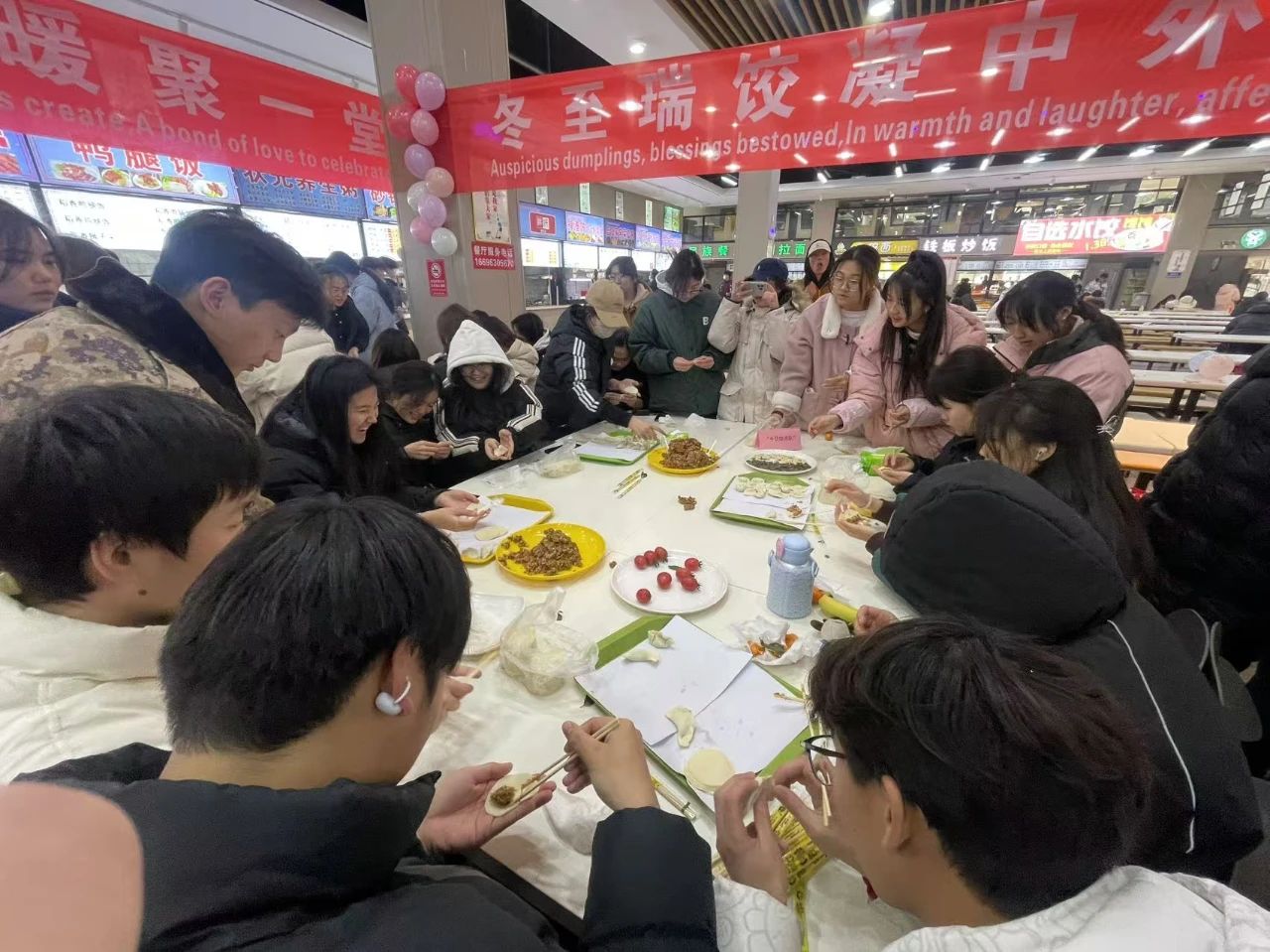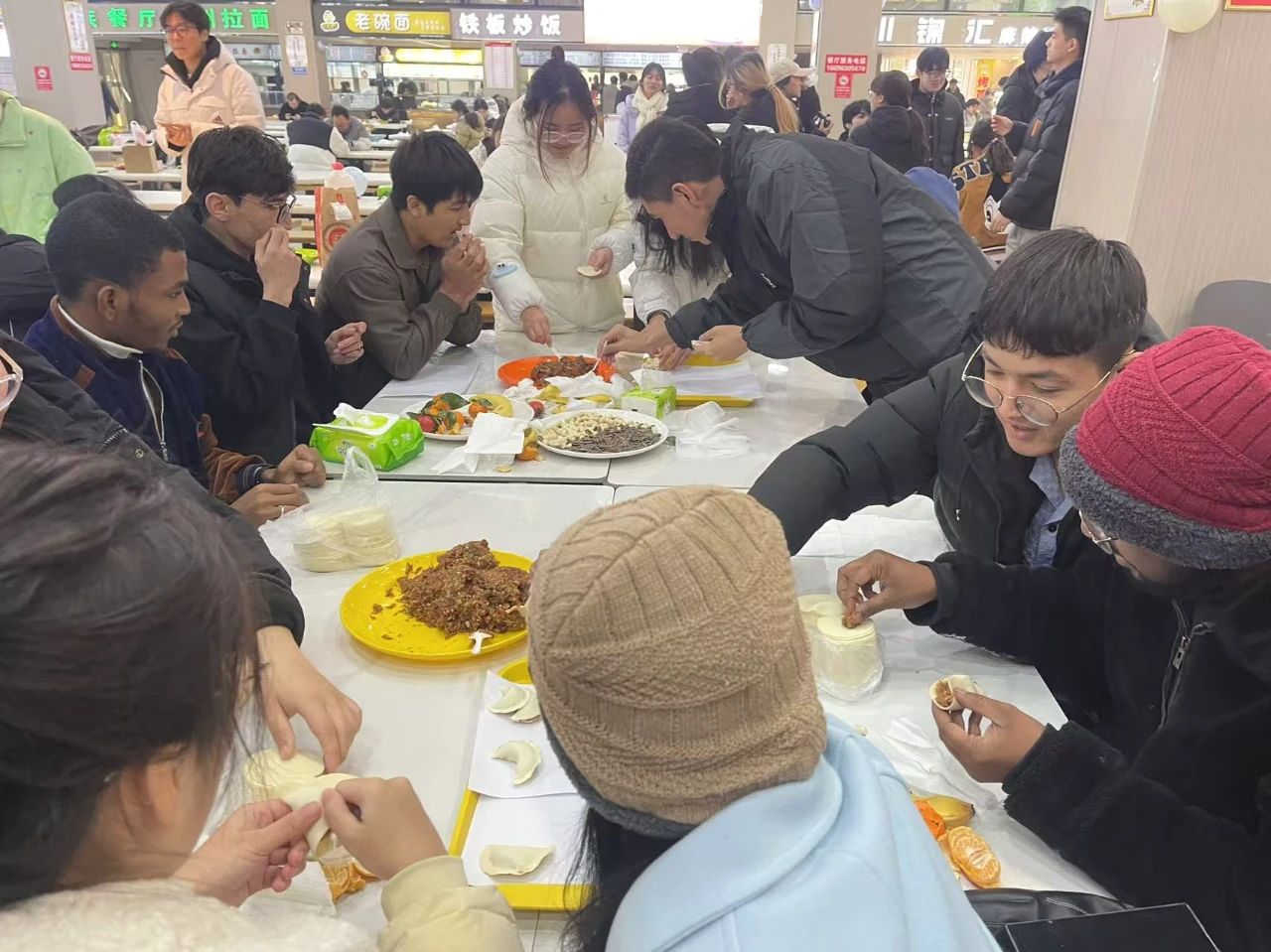 中外师生交流学习冬至的历史渊源和传统习俗,现场互动频繁,气氛热烈。外籍教师、留学生、国教院舞蹈队、羽人音乐社带来歌舞表演,在美妙的音乐和舞蹈交织的氛围中,包饺子的食材被一一摆放上桌面,中外师生们围坐在一起,相互帮助、相互学习,中方师生耐心地指导外教和留学生们,外教和留学生们也积极分享自己国家的美食文化,讲述着与中国饺子类似的传统食物。随着热气腾腾的饺子端上桌,中外师生们共同品尝起这美味的劳动成果。大家一边品尝,一边分享着此刻的喜悦心情。