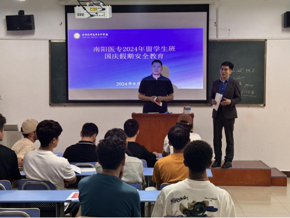 9月30日下午,南阳医专2024年留学生班国庆假期安全教育主题班会在孔明校区留学生楼603教室举行。外事国教党总支书记范卫杰主持班会,对外合作交流处、国际教育学院部分负责同志、来华留学生班班主任及12名在校留学生参加了此次班会。