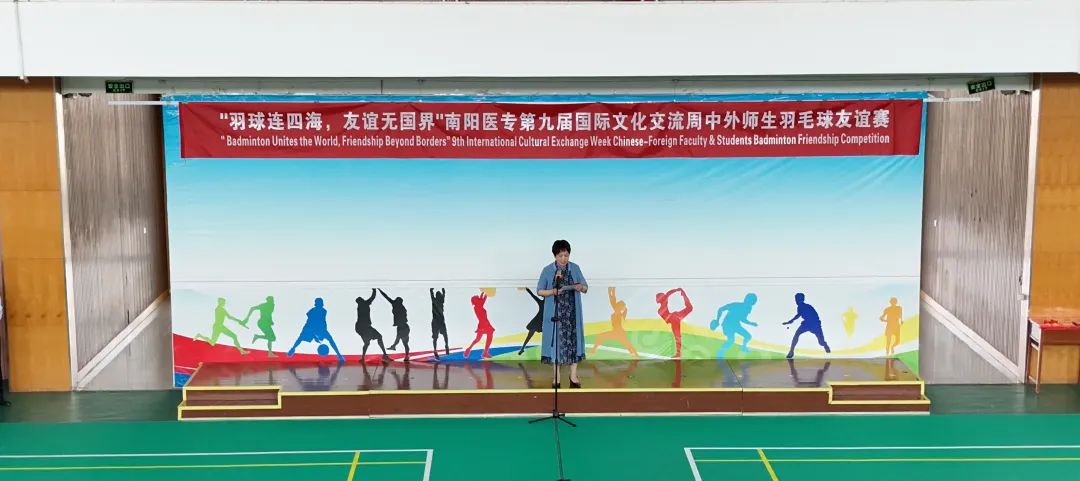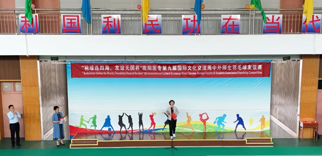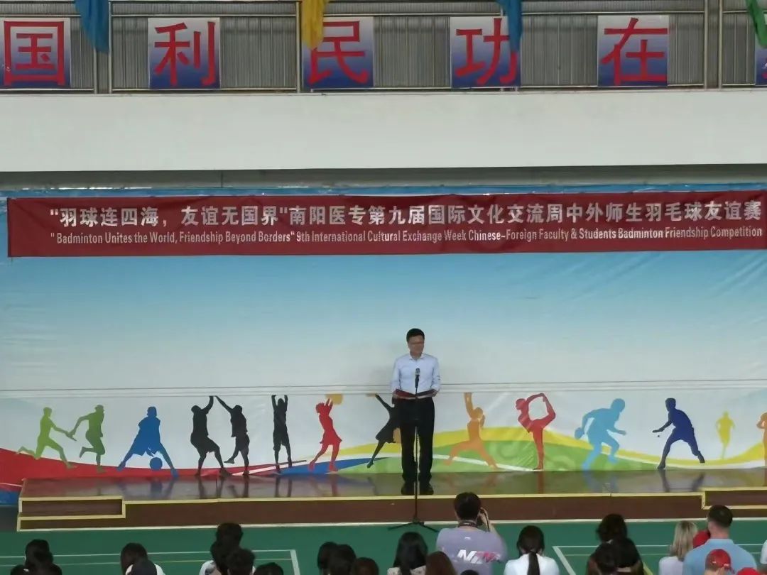 4 月 18 日,南阳医专第九届国际文化交流周中外师生羽毛球友谊赛在仲景西区体育馆正式拉开帷幕。河南省教育厅对外合作与交流处处长王华星、郑州大学国际教育学院院长麻哲,华北水利水电大学国际教育学院院长李胜机,校党委书记柳明伟,校党委副书记、校长范真,党委副书记刘涛,党委委员、纪委书记刘金云出席本次活动,活动由范真主持。