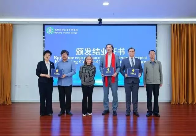 4月25日,南阳医专2025年第二批中医适宜技术国际培训(俄罗斯班)结业典礼在仲景文化中心719室举办。校长范真出席并致辞,副校长刘荣志和菲律宾伊密里欧学院副校长米兰达博士为学员颁发证书。纪委书记刘金云主持。