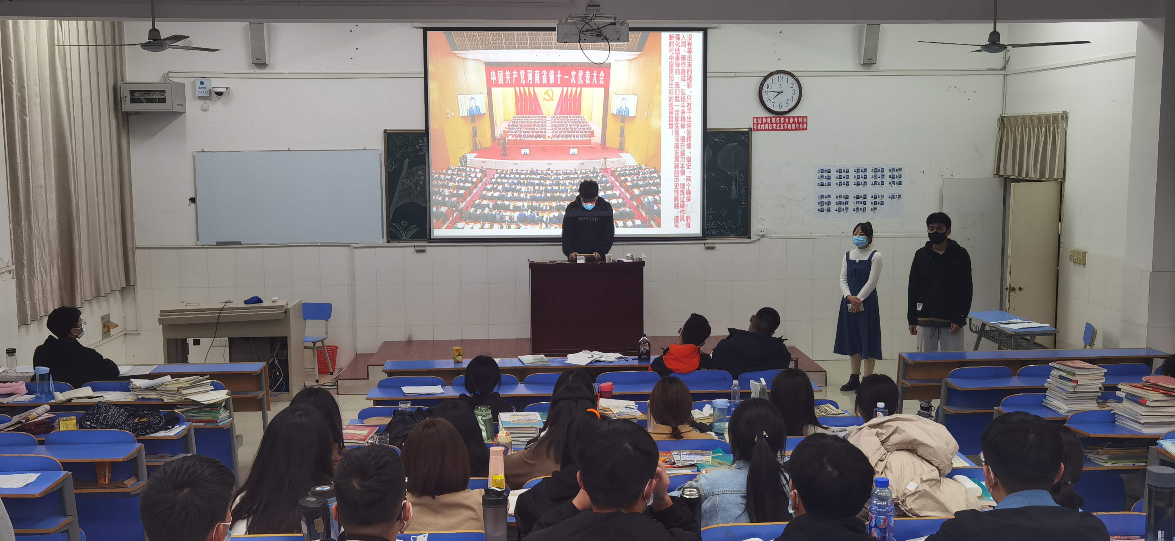 11月17日晚自习,国际教育学院以班为单位,组织开展了“学习河南省第十一次党代会精神”主题班会。各班班主任领学了省第十一次党代会报告。同学们就报告内容展开了热烈讨论。
