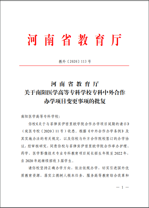 日前,从河南省教育厅传来好消息,经省教育厅教外【2020】113号文件批准,我校与菲律宾伊密里欧学院护理、药学、医学影像技术3个专业的中外合作办学项目成功获得延期,自2020年至2022年,为期三年。