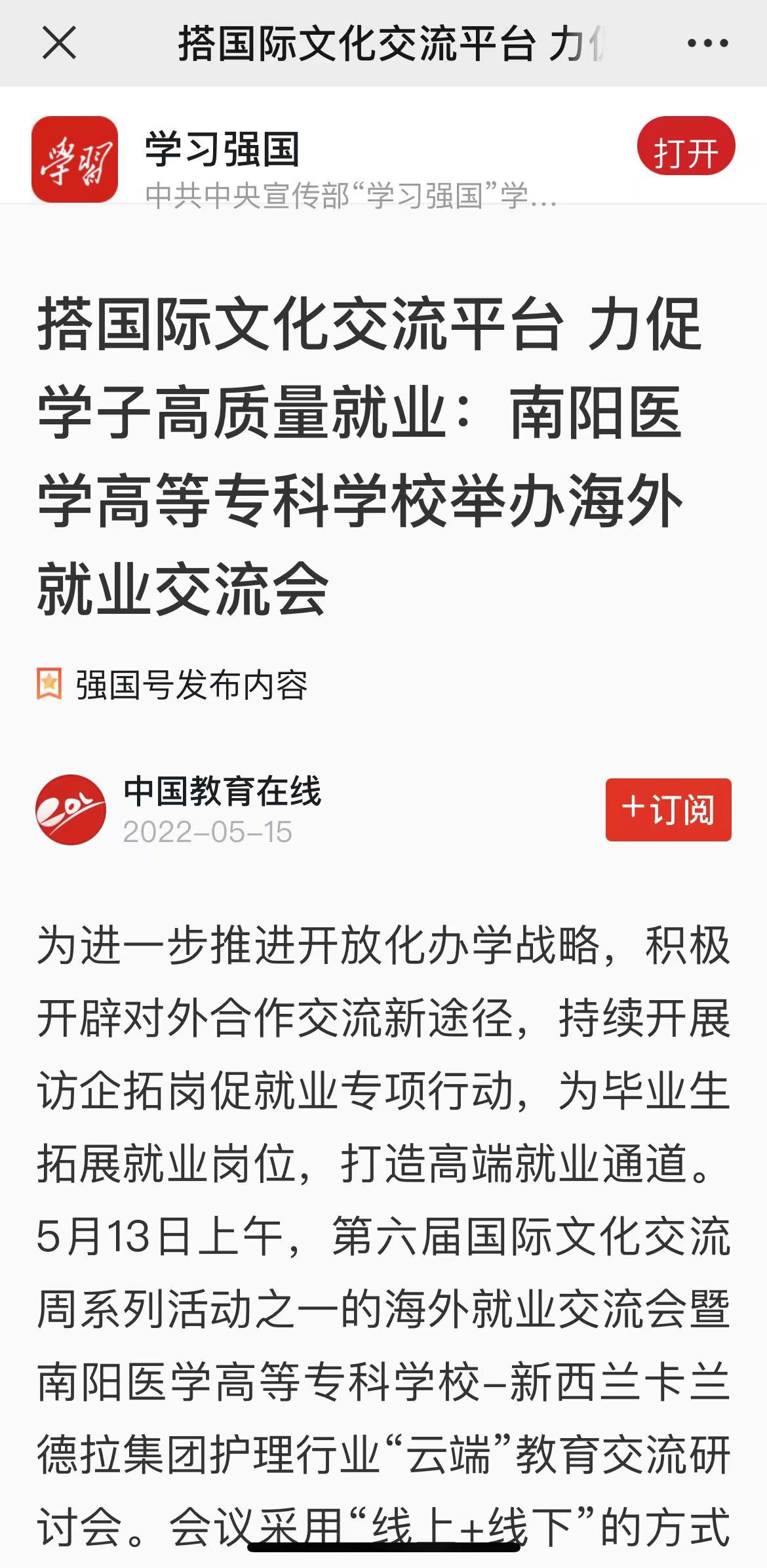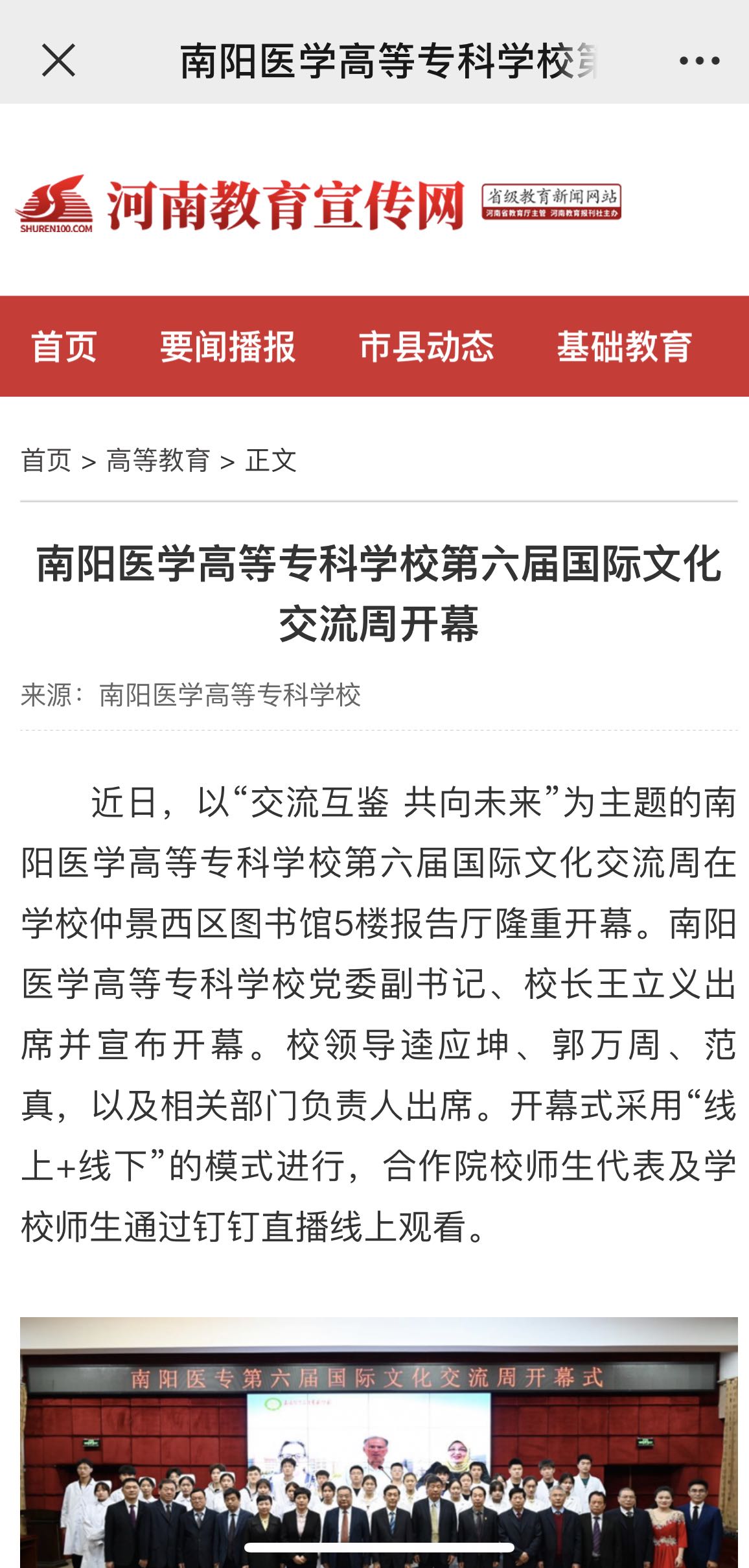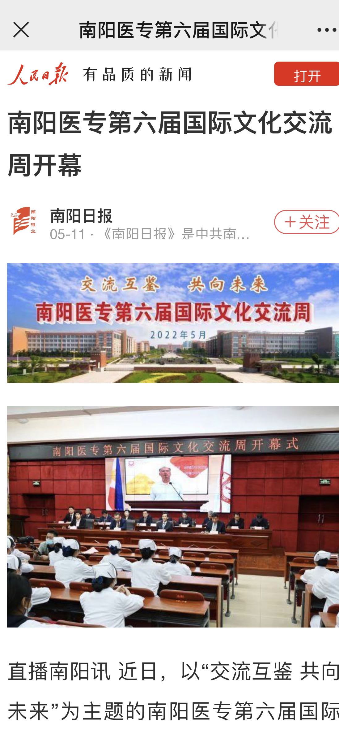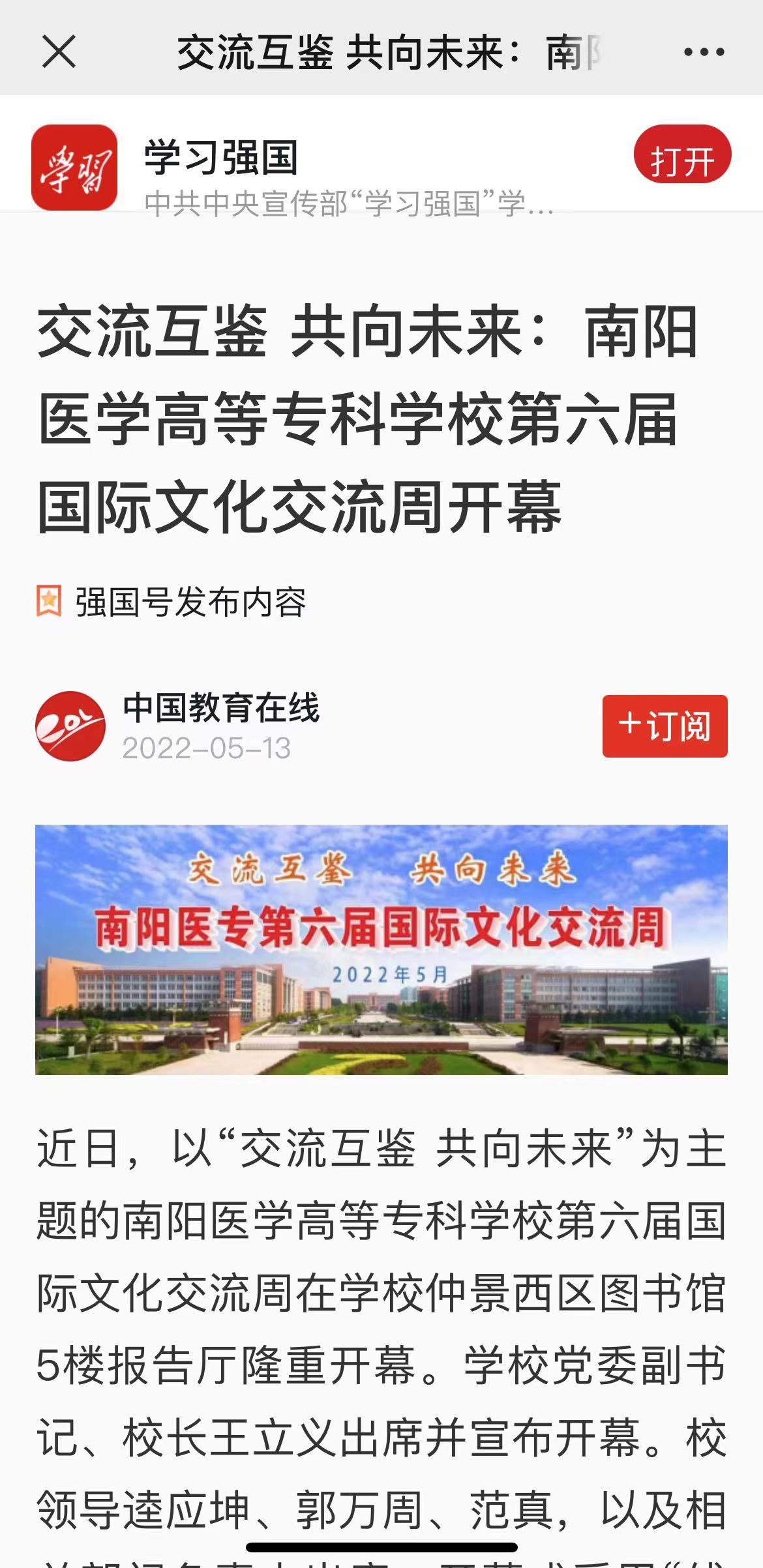 以《交流互鉴 共向未来》为主题的第六届国际文化文化交流周宣传片,受到了师生的一致好评。5月13日、15日,学习强国、中国教育在线、河南省教育厅教育宣传网、大象新闻、今日头条、网易新闻、南阳日报等多家媒体纷纷关注报道。