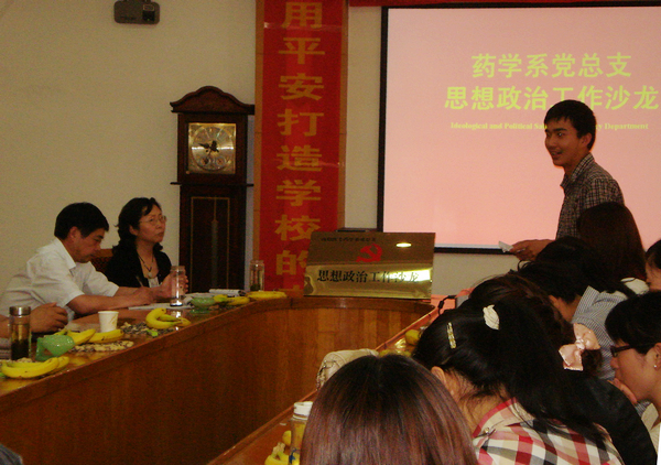 卧龙派出所的刘延政警官、学校保卫处曹兴军老师和生活服务中心的 李红霞、李晓兰二位老师也分别就社会治安、校园及宿舍安全等热点问题进行了分析和讲解。药学系副主任査道成、辅导员办公室主任邢献昆及多位老师和学生代表踊跃发言。辅导员孙丁贺老师还为大家展示了校园安全案例课件。整个活动现场气氛轻松活跃,大家畅所欲言,通过互相交流互相启发互相学习,分享了经验、统一了思想,开拓了思路,取得了很好的效果。
