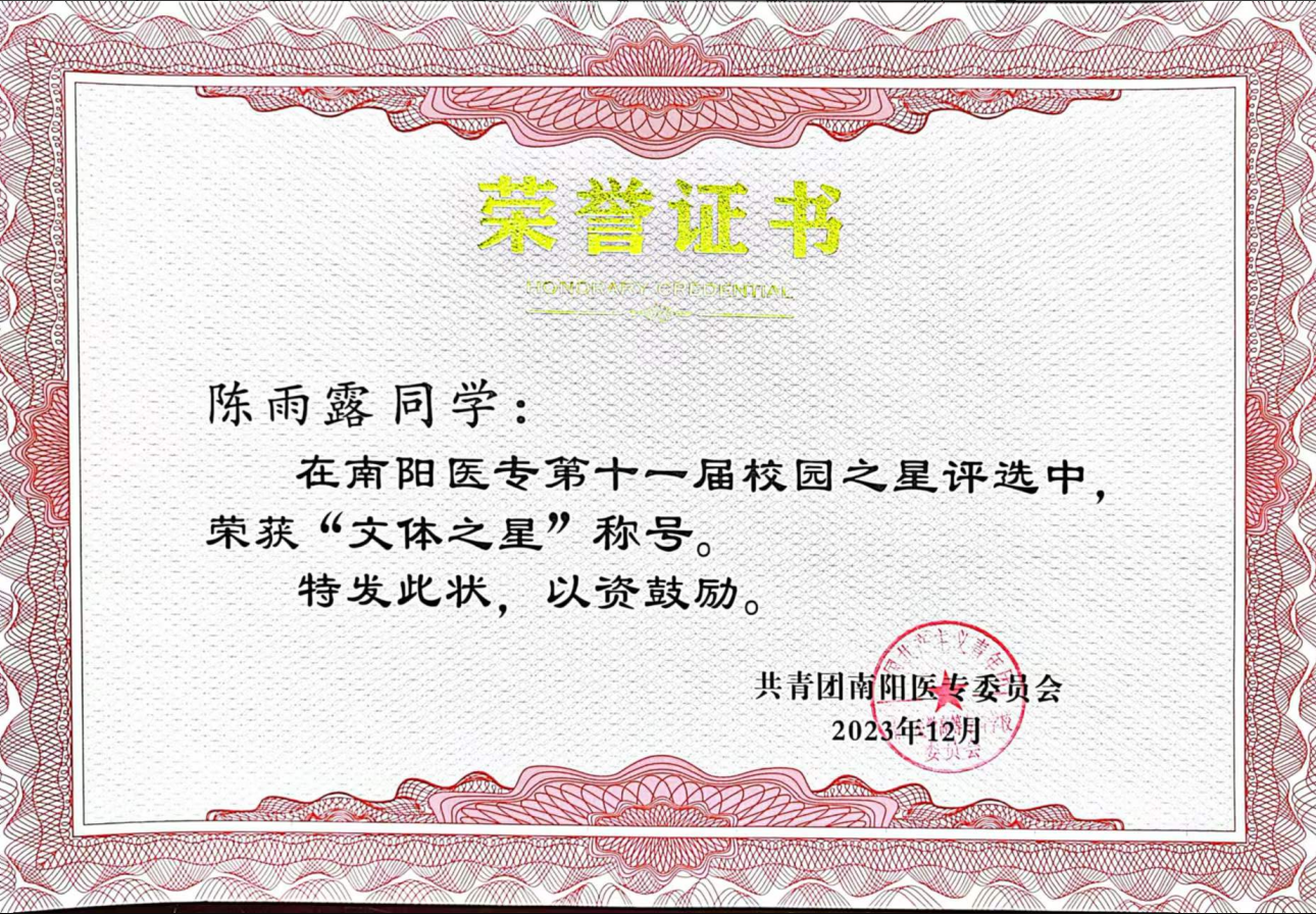 陈雨露,女,共青团员,南阳医学高等专科学校针灸骨伤系2022级普大中医骨伤二班学生