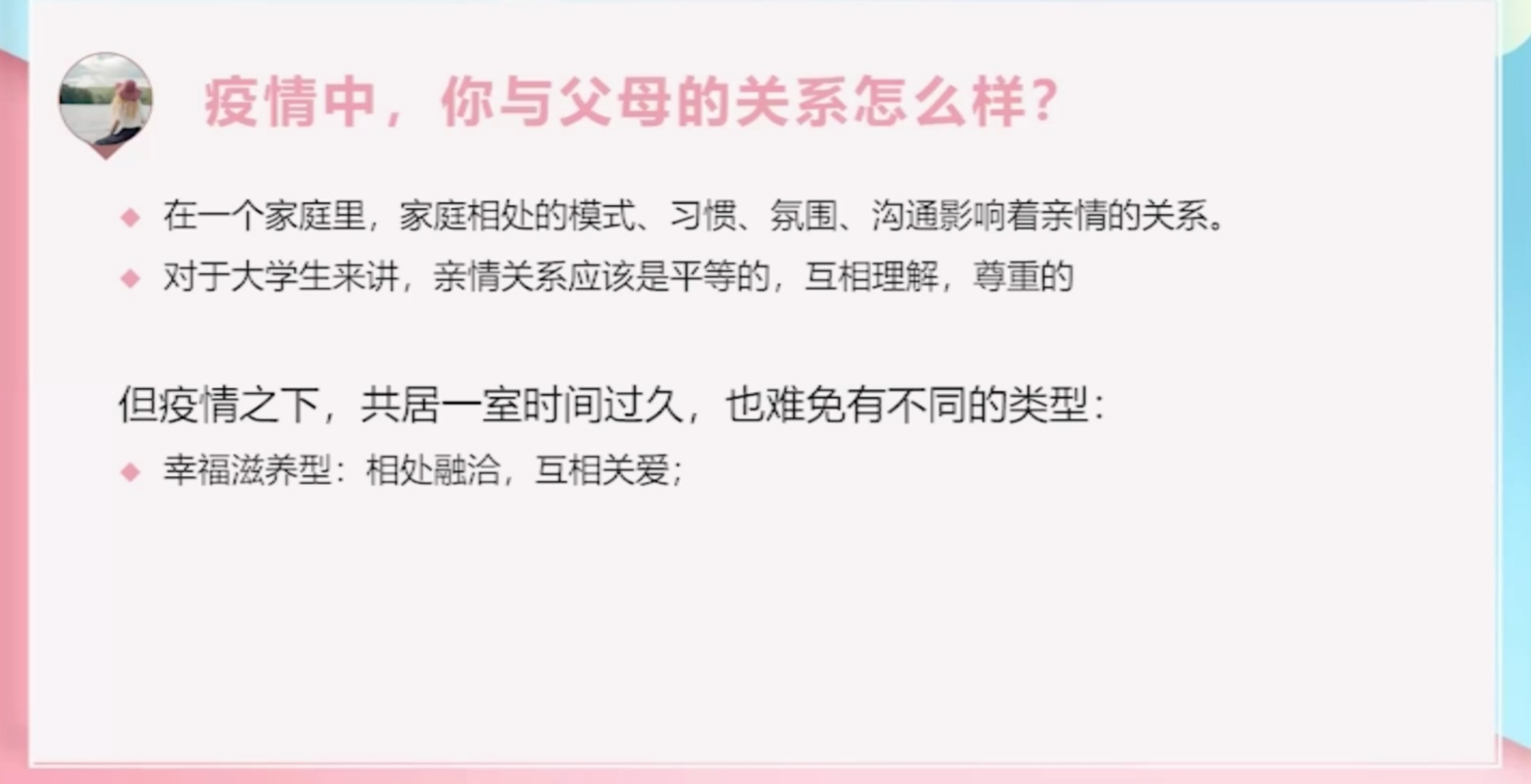 1. 在疫情环境下,越来越多的学生对失去正常学习秩序而感到困扰,虽然有网课的介入,但学习效果差强人意,学习进度被打乱,部分学生家庭受疫情影响,经济得不到保障,家庭关系不和谐,毕业计划的改变等一系列突发状况,都会引发学生焦虑。因此这种不受控制的感觉以及对未来的不确定性造成了严重的心理困扰,长时间的焦虑,使学生对重回校园有了更迫切的期待。