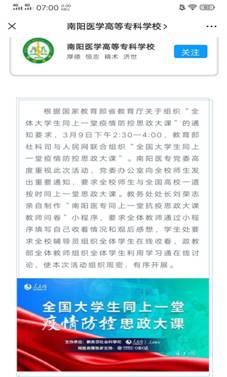 根据省教育厅及学校关于组织“全体大学生同上一堂疫情防控思政大课”的通知要求,3月9日下午2:30—4:00,政教部组织全体教师准时收看了教育部社科司与人民网联合组织“全国大学生同上一堂疫情防控思政大课”,并通过学习通组织全校学生进行线上学习讨论,深化对“疫情防控思政大课”相关内容的认识。