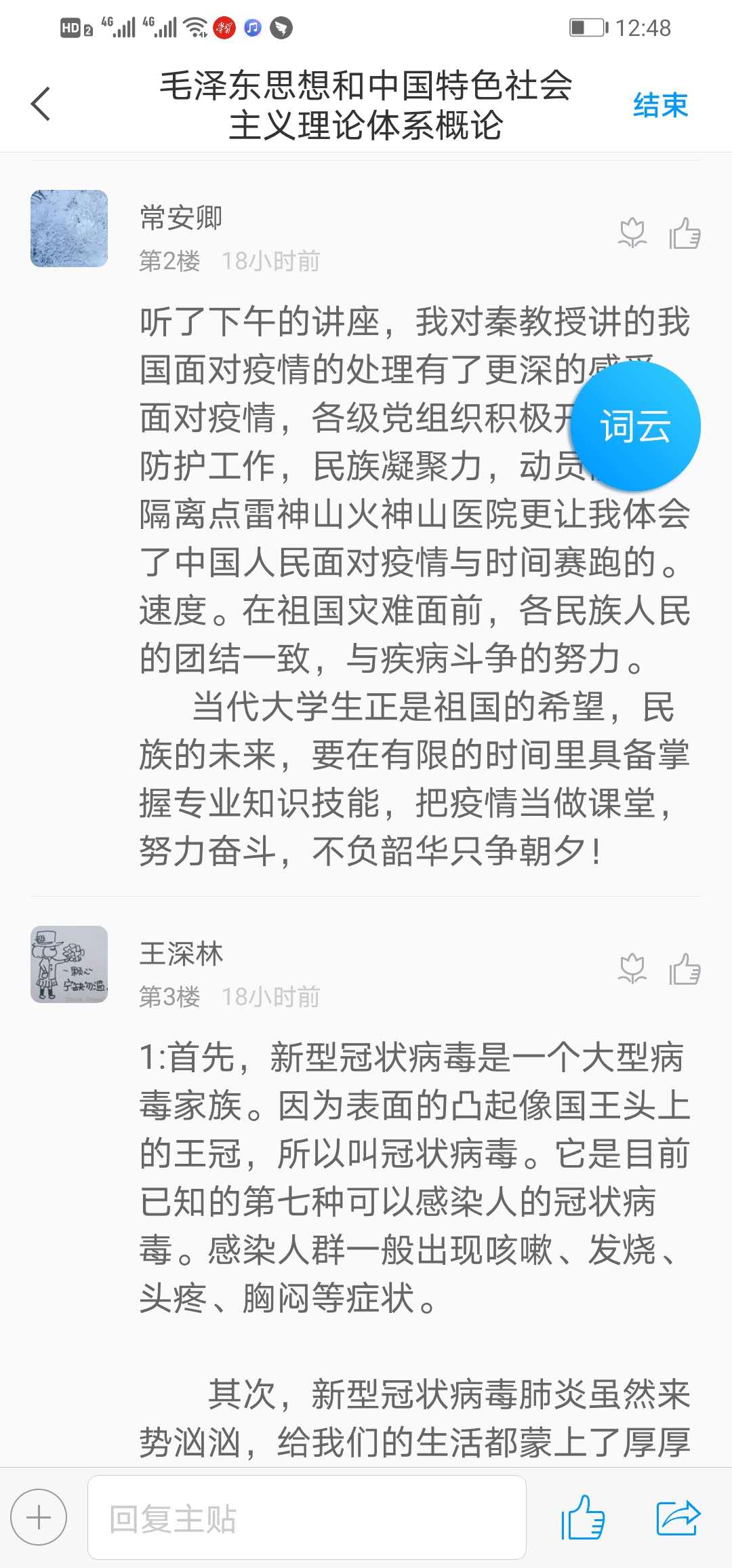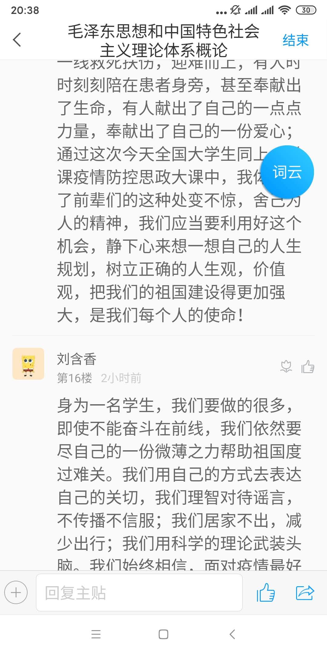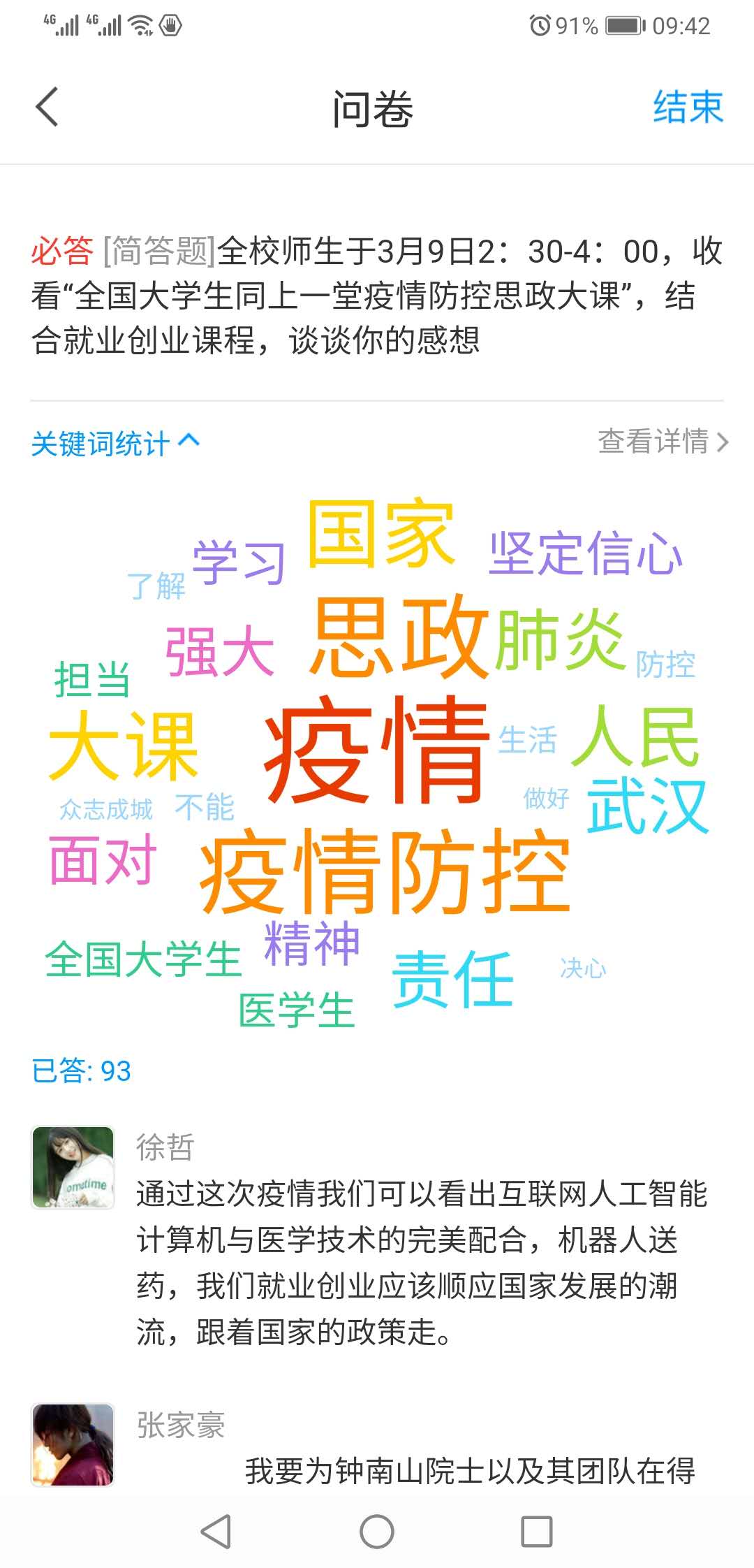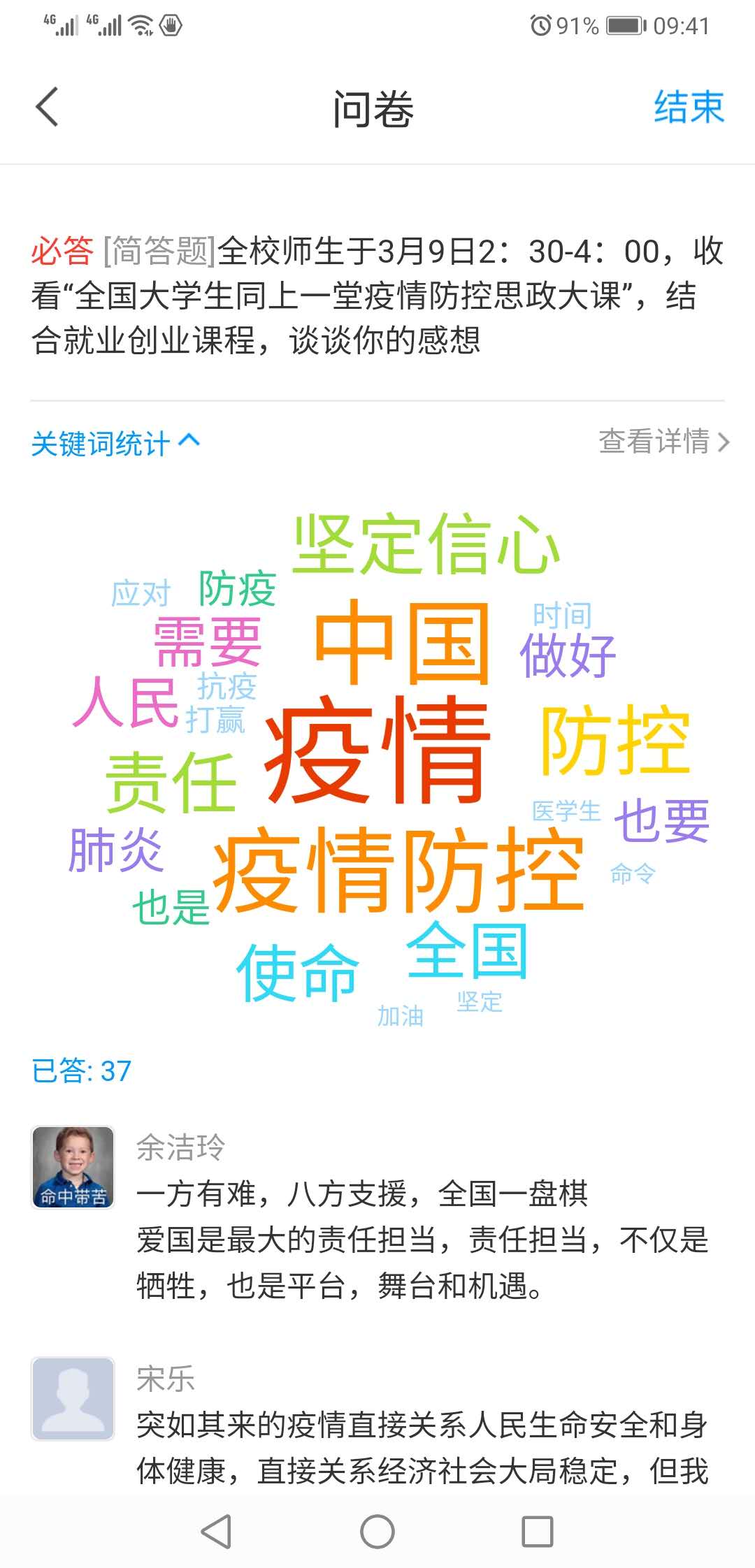 当天的“疫情防控思政大课”听的同学们热泪盈眶、精神振奋,争先恐后发表各自的感想和体会。老师们也被这热烈的讨论场面深深感染,很多年没有组织过这么成功的课堂讨论了,尽管是在线学习讨论,也能深切地感受到同学们激情澎湃的话语所蕴含的当代大学生的责任和担当。
