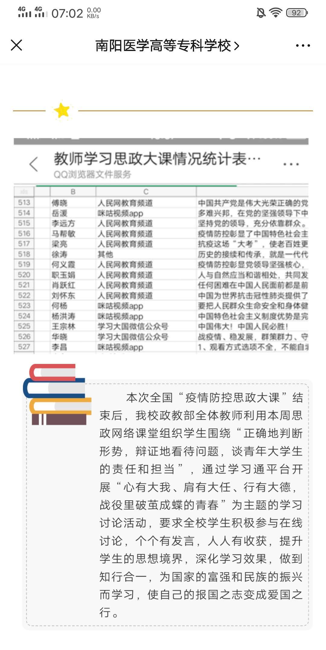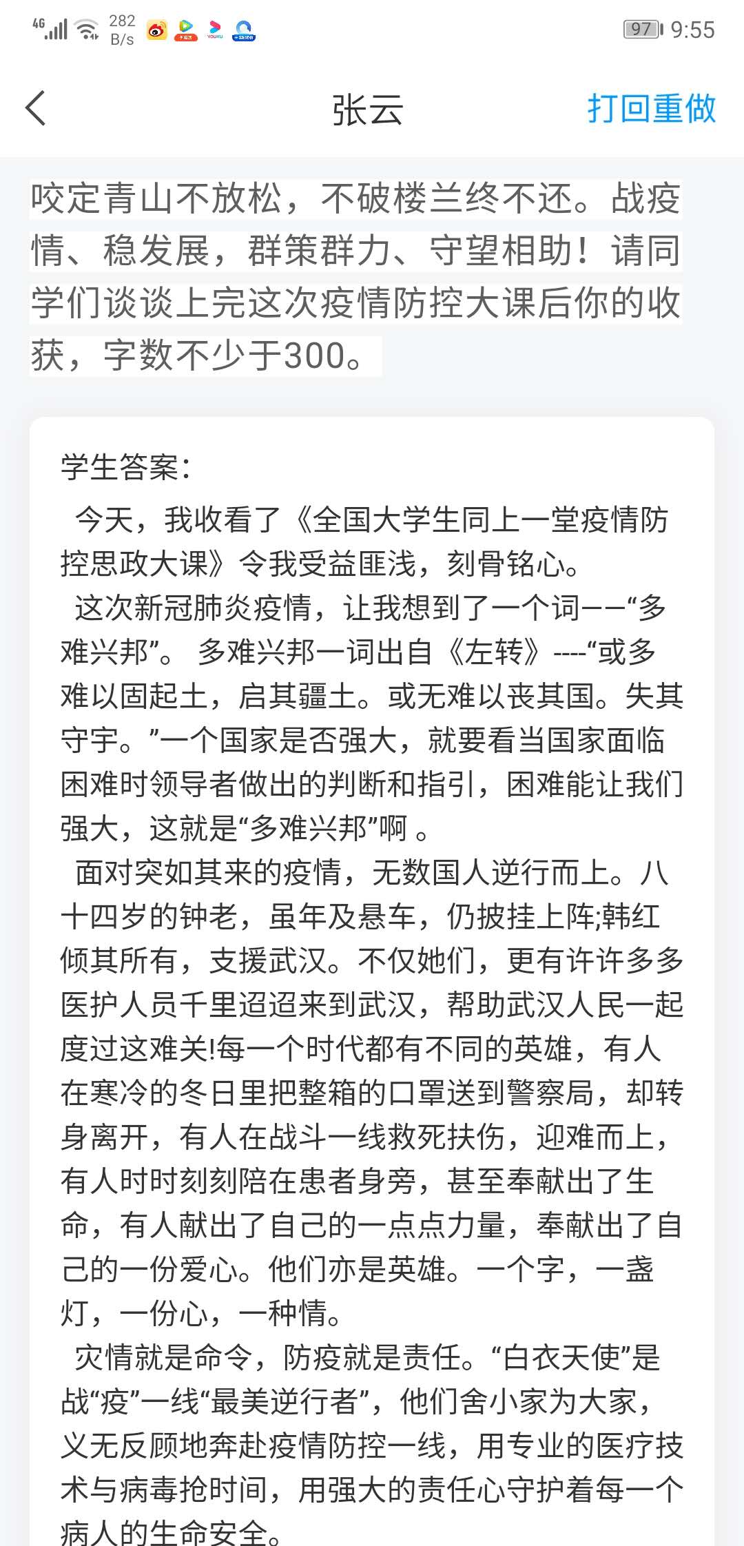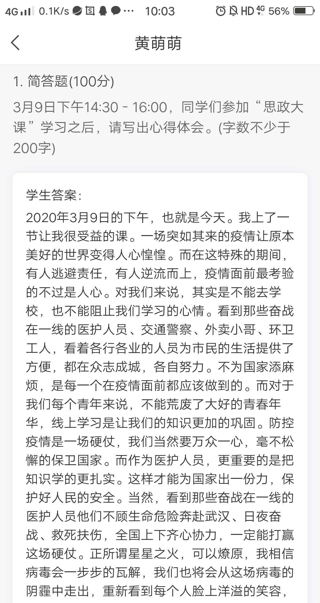 课后,安排全体学生完成以“心有大我、肩有大任、行有大德,战役里破茧成蝶的青春”为主题,谈谈上了此次“疫情防控思政大课”后的收获和感悟的课后作业,字数不少于500字。力争学习讨论覆盖全体在校学生,努力提升学习效果。
