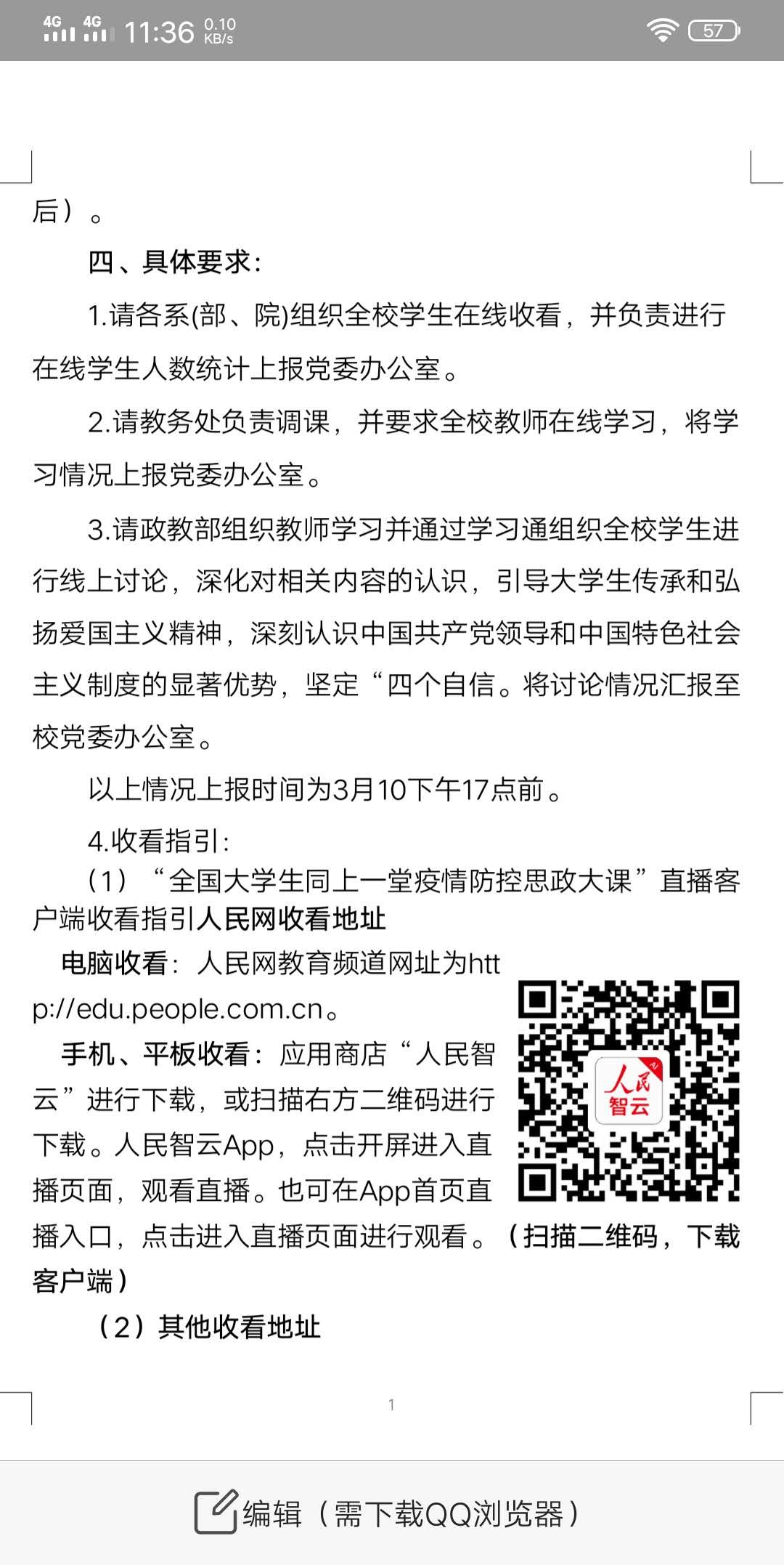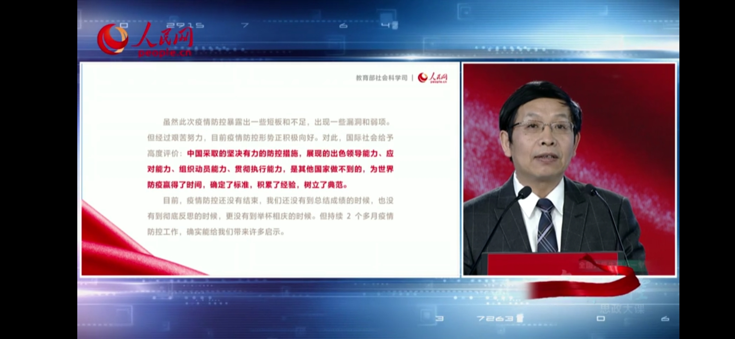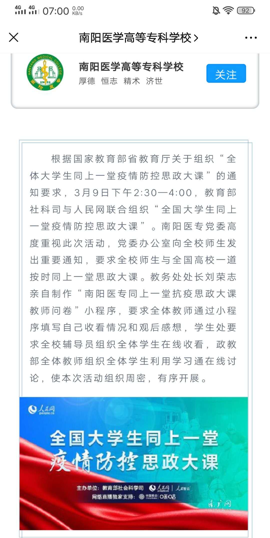 根据省教育厅及学校关于组织“全体大学生同上一堂疫情防控思政大课”的通知要求,3月9日下午2:30—4:00教育部社科司与人民网联合组织“全国大学生同上一堂疫情防控思政大课”。政教部组织全体教师准时收看、开展学习交流,并利用第四周一周时间,在思政课上通过学习通组织全校学生进行线上学习大讨论,深化对“疫情防控思政大课”相关内容的认识。