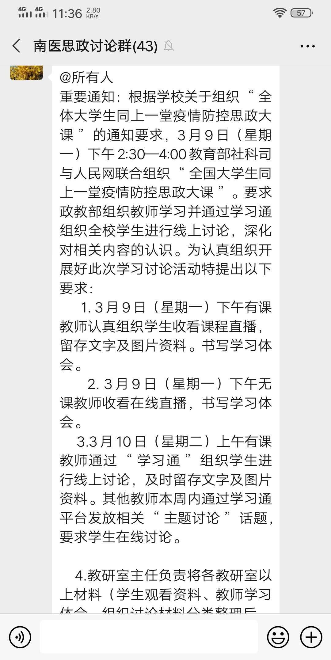 为认真组织开展好此次学习大讨论活动,政教部3月7日下午4点组织召开教研室主任钉钉视频会议,及时传达学校关于组织“全体大学生同上一堂疫情防控思政大课”的通知精神,安排部署学习讨论工作,冯主任结合教育厅及学校通知精神,强调此次学习讨论活动,时间紧任务重,要高度重视,认真组织学习讨论。并提出以下要求:一是3月9日下午全体政治课专兼职教师准时收看在线直播,认真书写学习体会。二是课程结束后,以教研室为单位开展学习交流。三是3月10-14日全体教师在思政课上通过学习通组织学生进行线上学习讨论,及时留存文字及图片资料。四是教研室主任负责将各教研室教师学习交流资料、教师学习体会、组织讨论材料分类整理交政教部办公室汇总上报。