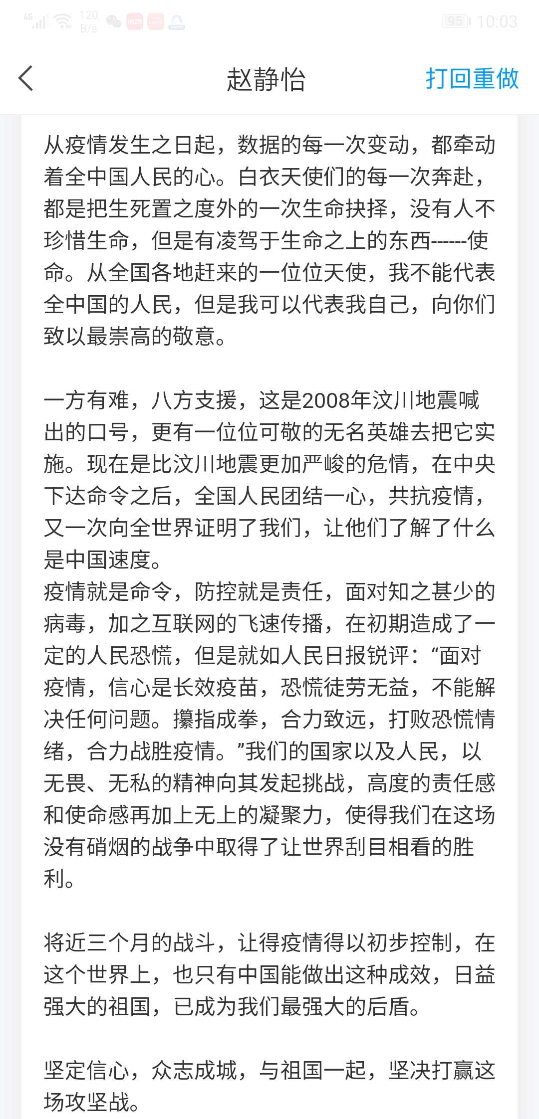 今天,是我平生最特殊的一堂课了。讲的真好,撼动人心,对于那些不幸感染新冠肺炎的人来说,这场病痛是他们人生中的一场苦难,在苦难面前,有人自怨自艾、有人轻易放弃,有人却不气馁,活出了勇气和信心。应对挑战从来不是一句空话,而是从当下的一时一刻、一举一动做起的,比如调整心态,逐渐让自己进入学习状态,赶紧收收心;给自己列个规划,哪个时间点睡觉,哪个时间锻炼,做到心里有数;宅在家里,脱离了课堂的学习氛围,更应该要求自己养成好的学习习惯,为新学期打下基础。在这个特殊时期,感谢领导关心到大学生的思想政治,让当代青年感受到了祖国对我们的期望!作为当代大学生,应肩负起年轻人的责任,保持积极乐观的心态,响应党的号召,共同抗疫,早日度过难关。中国加油!