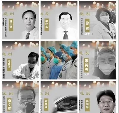 徐辉,51岁,南京市中医院副院长,连续奋战18天后牺牲在疫情防控战场上;柳帆,武昌医院护士,已59岁的她牺牲前曾主动申请延迟退休。还有江西省赣州市大余县疾病预防控制中心医师蒋波、湖北省中西医结合医院耳鼻喉科医生梁武东、福建省南平市浦城县仙阳镇中心卫生院副院长毛祥洪、江苏泰州市人民医院感染科医生姜继军……他们都拼尽全力,倒在了战场。