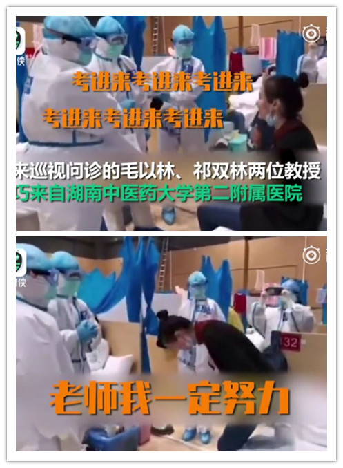 前两天,武汉江夏大花山方舱医院,一位大四的医学生患者正与医护人员谈心,她说自己要考湖南省中医药大学的研究生。神奇一幕发生了,前来巡视问诊的两位医生正好是湖南中医药大学第二附属医院的毛以林、祁双林教授,毛老师恰好又是湖南中医药大学的博士、硕士生导师。女孩捂着嘴不敢相信,旁边医生笑着起哄,“考进来!考进来!”毛老师对她说“欢迎你!祝你早日康复,要做好吃苦耐劳的准备。”女孩两次鞠躬,“老师我一定努力!”