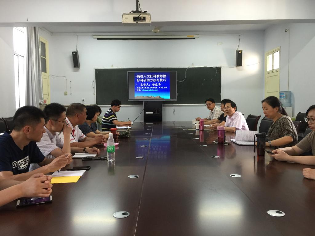 为进一步提高我校思想政治理论课教师人文社科科研水平,落实好校党委书记全新明在政教部调研时的讲话精神,加强思政理论研究工作,6月13日下午,政教部邀请到湖北大学博士生导师杨业华教授到校开展讲学活动,政教部主任冯晓青主持,思政课专兼职教师参加活动。