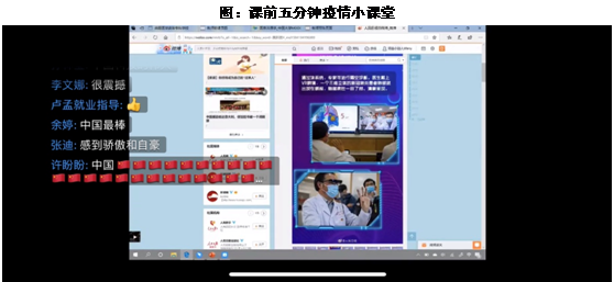 堂,帮助学生扣好人生的第一粒扣子,也是我们义不容辞的责任、不敢忘怀一刻的初心。疫情期间,每天都有许多事件能够引起青年学生们的热议,这些探讨无不体现着不同价值观的碰撞与交锋,恰恰是我们引导学生树立正确三观的契机。每次上课,我都提前五分钟开始直播,跟同学们提一提微博热搜上的正面案例,同学们也会有感而发表达对国家的热爱之情、对神圣医护工作的新思考。