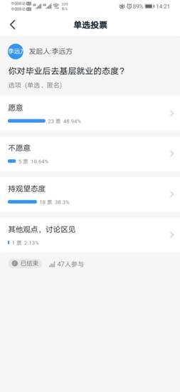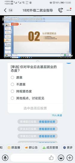 对于学生呢,课堂中那种熟悉的氛围同样不见了,互动感会低很多。虽然线上学习中互动交流是难题,但教师可利用多种途径增加互动,比如,教师可以在钉钉平台利用投票、测试工具了解每个学生的学习情况,或对某个问题的看法,例如,调查同学们对于基层就业的看法,基本每个同学都参与了投票: