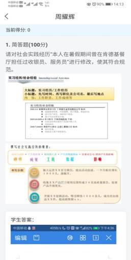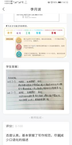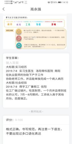 教师还可以在学习通平台上给学生布置书面作业,通过作业批改来了解学生整堂课的掌握情况。例如:在制作简历这一节时,要求大家规范书写简历中的某一部分,教师可以查看提交情况以及进行批阅。学生可立刻看到老师的反馈结果,对于大家集中出现的问题,教师可在下一次课进行讲解。