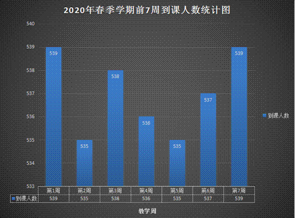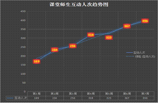 2020年2月17日至4月2日,我共计完成35个教学日、152节次教学任务,累计在线时长不低于6080分钟,区分11项专题向共计77个班次3754名学生进行网络授课,其中签到学生3694名,平均到课率98.4%。通过数据统计分析得知,前7周完成了规定课时的教学任务,除个别学生因网络、生病等原因未按时到课外,其他学生无能按时按量完成网课学习,师生互动人次总体呈现上升趋势。