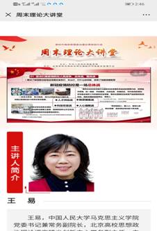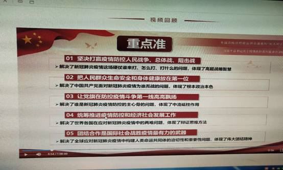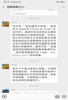 5月22日下午政教部组织全体专兼职教师全国高校思想政治理论课教师“周末理论大讲堂”,在线收看了中央马克思主义理论研究和建设工程首席专家、中国人民大学马克思主义学院党委书记兼常务副院长王易教授就习近平总书记关于疫情防控的系列重要讲话精神进行专题辅导。