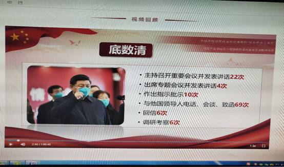 王易教授围绕以下三方面进行了讲解。第一,底数清。习近平总书记主持召开了疫情防控重要会议并发表重要讲话22次,作出指示批示10次。第二,重点准。一是坚决打赢疫情防控人民战争、总体战、阻击战。二是把人民群众生命安全和身体健康放在第一位 。三是让党旗在疫情防控第一线高高飘扬。四是统筹推进疫情防控和经济社会发展。五是团结合作是国际社会战胜疫情的最有力的武器。第三,转化活。一是在经历中学习,讲好抗疫故事。二是在比较中学习,彰显制度优势。三是在思考中学习,凝聚精神力量。