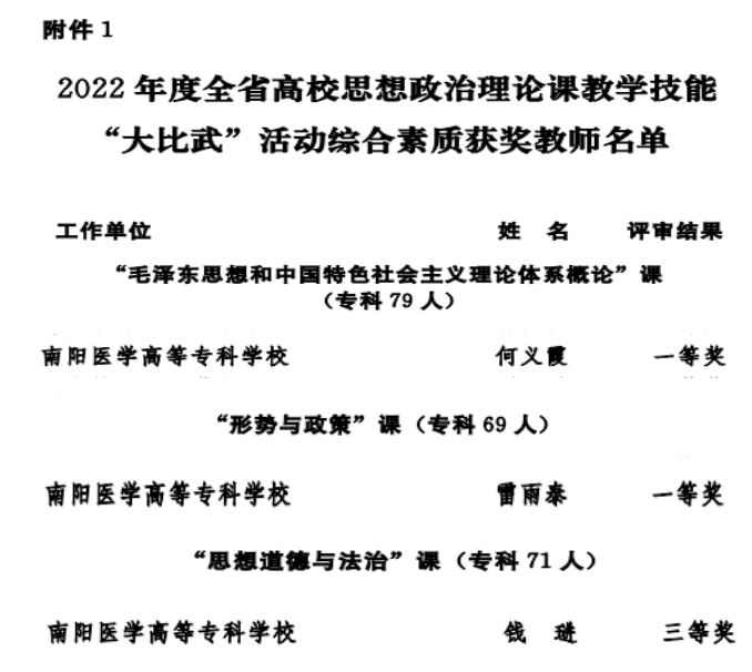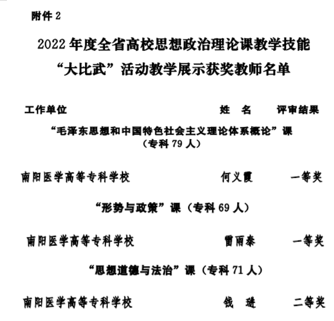 近日,省委宣传部、省委教育工委、省教育厅公布了2022年度全省高校思政课教学技能“大比武”活动的评选结果(豫教工委[2022]84号文件),我校马克思主义学院何义霞、雷雨泰两位教师每人荣获“大比武”活动“综合素质”和“教学展示”两项一等奖,钱琎老师获得“综合素质”三等奖、“教学展示”二等奖。