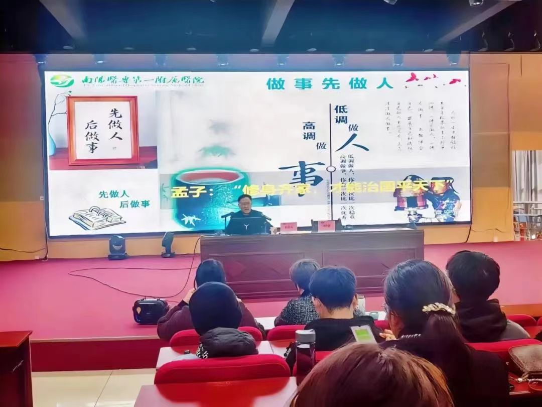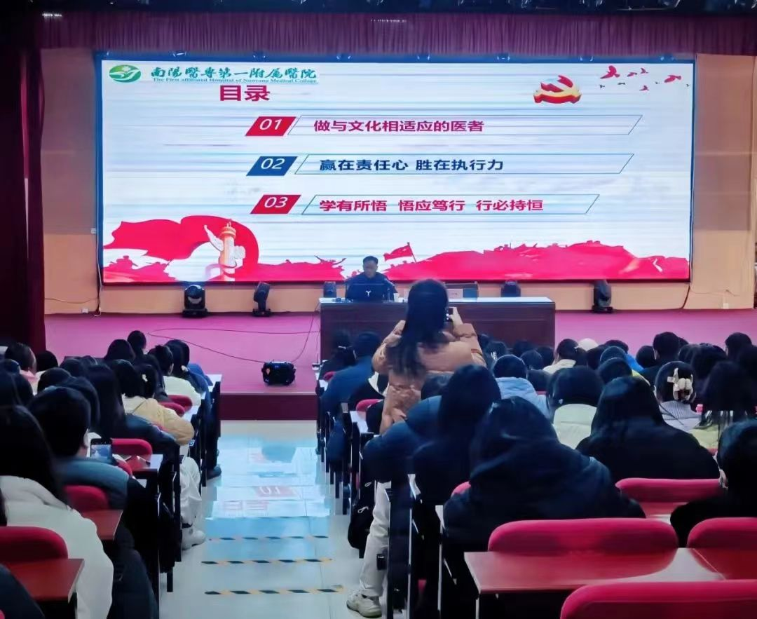 郭遂成以《深刻领悟习近平文化思想 不负群众的生命重托》为题进行授课,结合学习贯彻习近平新时代中国特色社会主义思想主题教育,领学了习近平文化思想的重要内涵,并联系自己30年从医实践,讲述了“赢在责任心 胜在执行力”重要问题,希望同学们认真学习习近平文化思想,做对党和单位忠诚可靠的人,努力做有温度的医务工作者,加强专业技术锻炼,加强医德修养,守护群众的生命健康。