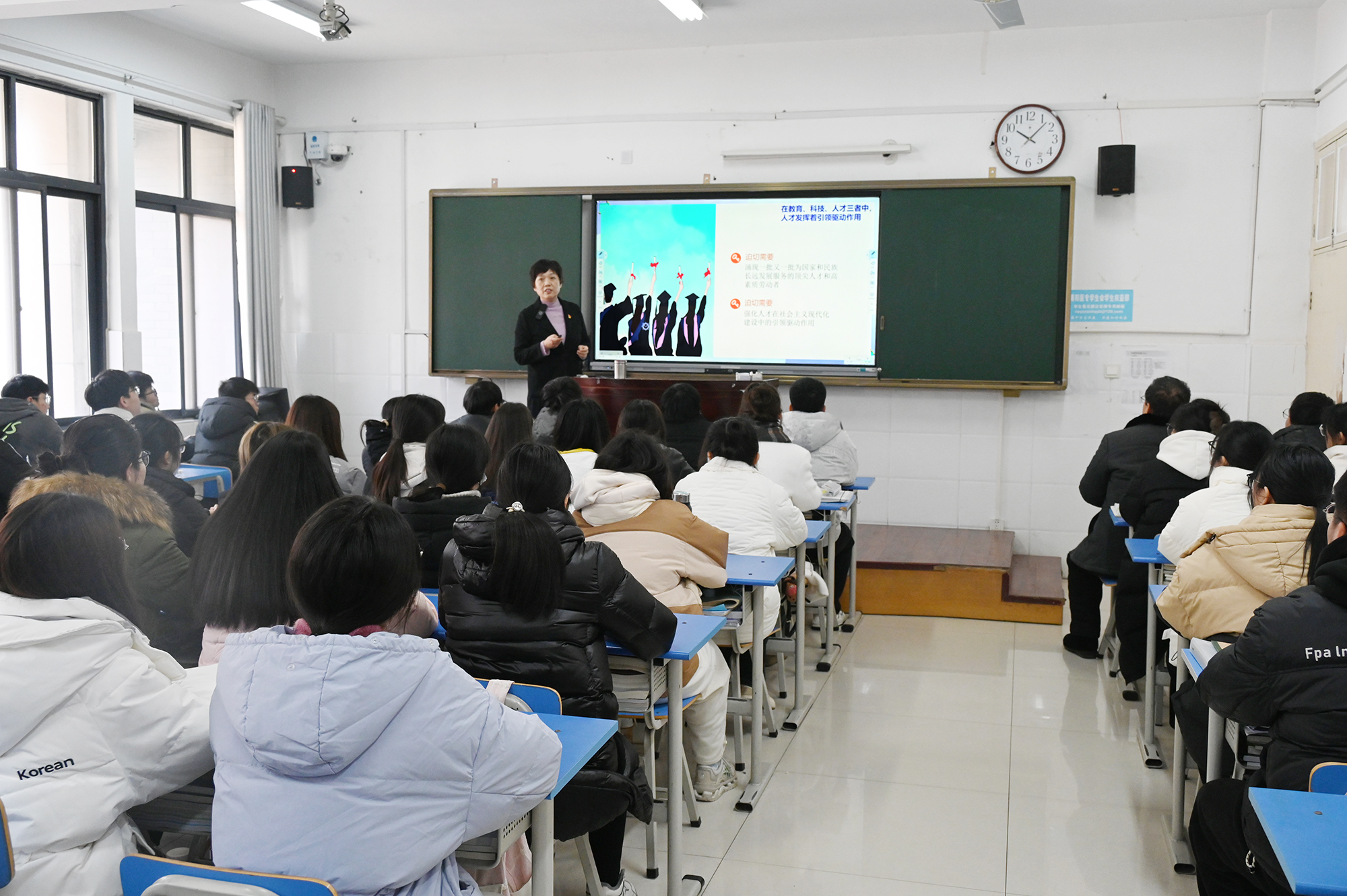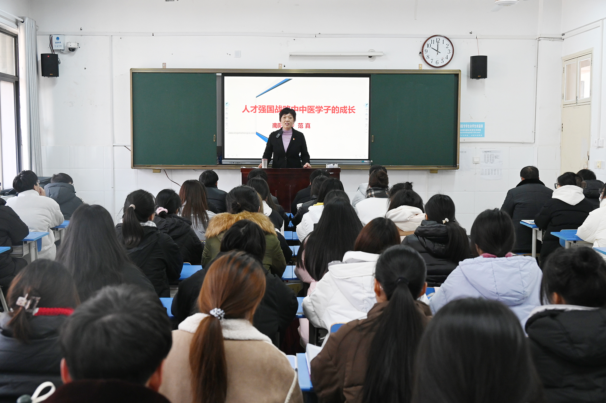 范真以《人才强国战略与中医学子的成长》为题,从“着眼长远发展的重大抉择”“铸就强国建设的坚实基础”“加快强国建设的战略部署”“充分发挥高校重要作用”四个方面深入阐释了党的二十大报告提出的“实施科教兴国战略、人才强国战略、创新驱动发展战略”的重要意义,并根据现代职业教育体系建设改革重点任务进行了深入讲解。她讲述了我校的发展历程,校党委在“职教三融”中如何实现以“职普融通”为关键点,以“产教融合”为突破口,以“科教融汇”服务创新驱动战略引领学校的发展。范真教导仲景学子要紧紧把握我国建设现代化职业教育发展趋势,努力学习专业知识,锤炼专业技能,打造复合型人才,为服务基层医疗卫生事业夯实基础,为服务大健康产业做好准备。