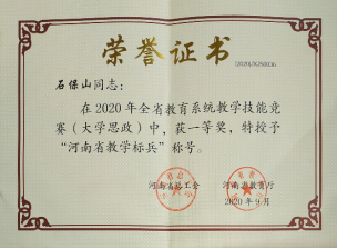 日前,在河南省教育系统2020年教学技能竞赛决赛(高校组)中,我校政教部教师石保山荣获一等奖。同时,石保山老师被河南省总工会、河南省教育厅授予“河南省教学标兵”荣誉称号。